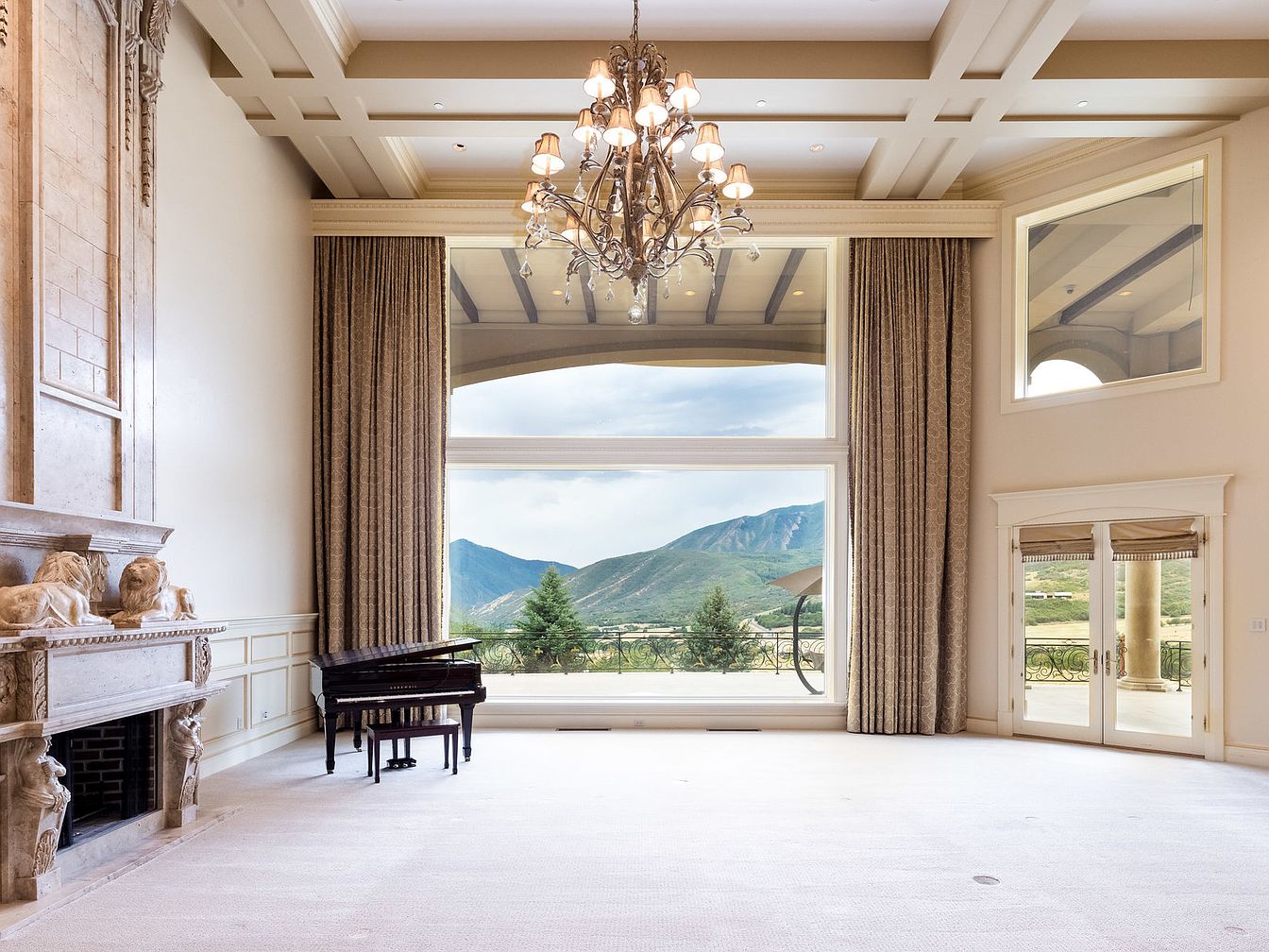 Expansive ceilings with elegant coffered detailing create a sense of openness and grandeur in this living room. Floor-to-ceiling windows flood the space with natural light and provide breathtaking views of rolling green hills, making this room perfect for family gatherings or quiet evenings at home. The neutral color palette, featuring creamy walls, plush carpeting, and ornate brown drapes, offers flexibility for a variety of furniture arrangements. A stately carved stone fireplace serves as a striking focal point alongside a classic black grand piano, blending artistry with function. French doors open seamlessly to the outdoor terrace, inviting indoor-outdoor living.