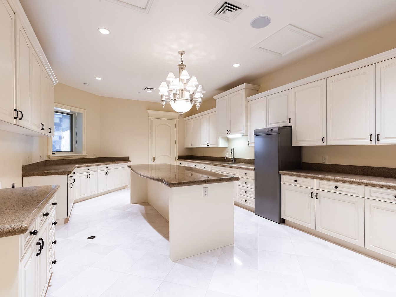This spacious kitchen features a large central island perfect for meal prep, casual dining, or family gatherings. The light cream cabinetry, accented with dark hardware, offers ample storage and complements the neutral-toned stone countertops. Soft beige walls and pristine white tile flooring create a bright and welcoming atmosphere. Modern recessed lighting, paired with a classic chandelier, ensures the space is well-lit and inviting. The layout promotes easy movement and functionality, making it ideal for busy families. A sizable window provides natural light, while the stainless steel appliances add a contemporary, practical element to the room.