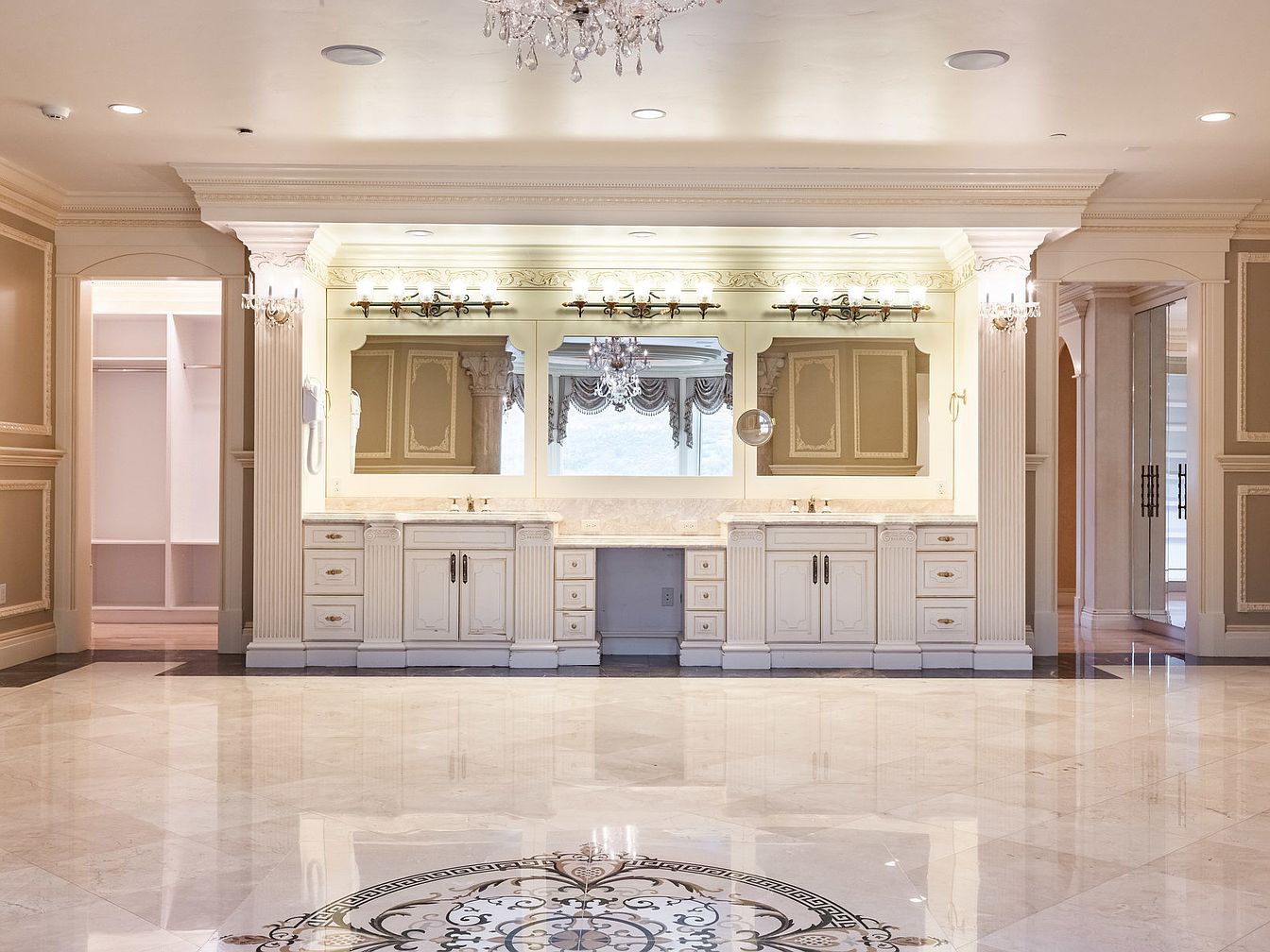 A spacious bathroom vanity area exudes luxury with its detailed architectural moldings, soft cream cabinetry, and gleaming marble countertops. Dual sinks are set beneath a large, ornate mirror framed by classical columns and warm vanity lighting, providing ample space for family use. A crystal chandelier adds a glamorous touch while polished marble floors, highlighted by a decorative mosaic medallion, reflect the room’s natural light. The open walk-in closet to the left and mirrored doors to the right ensure functionality and storage, making this space ideal for family routines while embracing a graceful, timeless aesthetic.