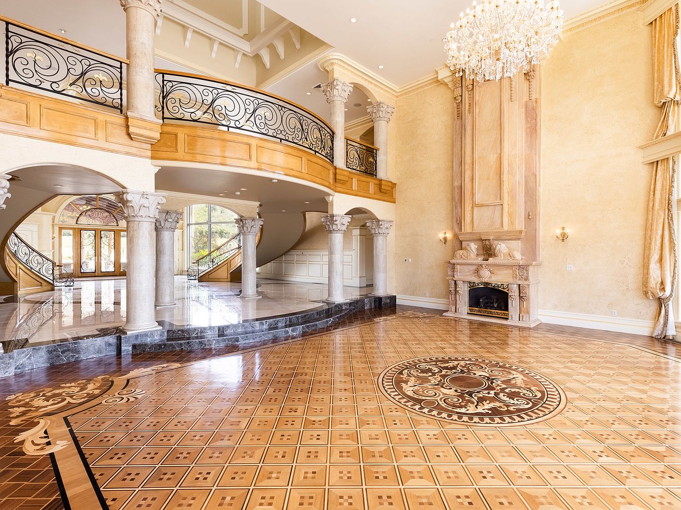 An impressive grand living room with soaring ceilings, elegant architectural columns, and a lavish chandelier as the centerpiece. The intricate parquet flooring features beautiful inlays and mosaic details, adding warmth and sophistication to the space. An elaborate marble fireplace anchors one wall, with custom woodwork and tall drapes framing the room. The open layout flows seamlessly towards the foyer, visible through arched passageways and accented by a sweeping staircase with ornate wrought iron railings. Natural light pours in through large windows, creating a bright, airy atmosphere perfect for both entertaining and relaxing in a luxurious family home.