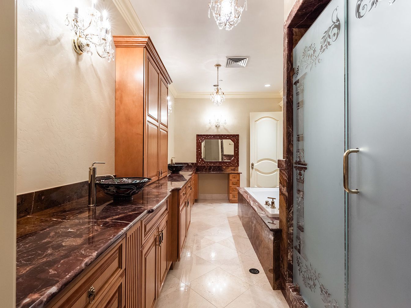 A spacious bathroom suite designed with opulence and comfort in mind, featuring rich cherry wood cabinetry and deep brown marble countertops that provide ample surface space. Crystal chandeliers and ornate glass sconces cast a warm, inviting glow, reflecting off the polished floors and adding a touch of elegance. The frosted glass shower enclosure displays intricate etched patterns, offering privacy and style. A soaking tub is nestled at the far end with surrounding marble trim, perfect for relaxing family baths. The soft cream walls and thoughtfully placed mirrors enhance the room’s sense of light and space, creating a welcoming environment for all ages.