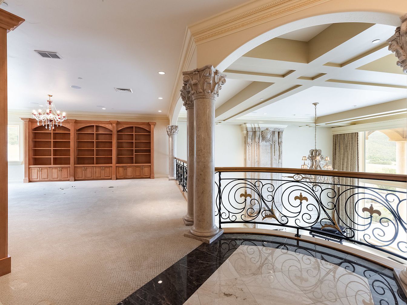 A spacious loft area designed for both relaxation and intellectual pursuits, featuring expansive built-in wooden shelves ideal for displaying books, games, or treasured family items. Neutral-toned carpeting underfoot adds a cozy touch, while natural light filters in through large windows. Architectural elegance is highlighted with ornate columns, intricate iron railings, and a chandelier providing ambient lighting. Soft cream and tan hues dominate the color scheme, offering a warm, sophisticated atmosphere that’s perfect for children to read or families to gather and play. The open rail overlooks a grand living space below, blending privacy with connectedness.