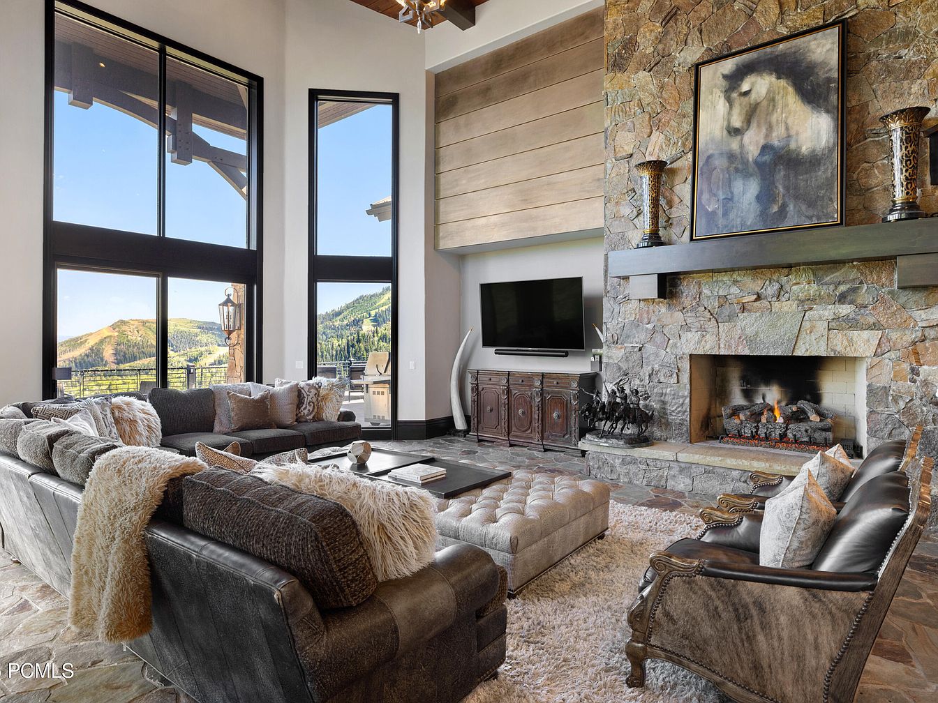 Expansive floor-to-ceiling windows frame breathtaking mountain views, filling this cozy living room with natural light. The high ceilings enhance the spacious feel, while the rustic stone fireplace serves as a stunning focal point, adding warmth. A plush sectional couch adorned with textured throw pillows invites relaxation, complemented by a chic tufted ottoman at its center. Rich, dark wood accents blend harmoniously with the soft greys and warm whites of the decor. This family-friendly space balances elegance and comfort, making it perfect for gathering. Rich textures abound, from the shaggy area rug to the leather armchairs, exuding a luxurious yet inviting atmosphere.