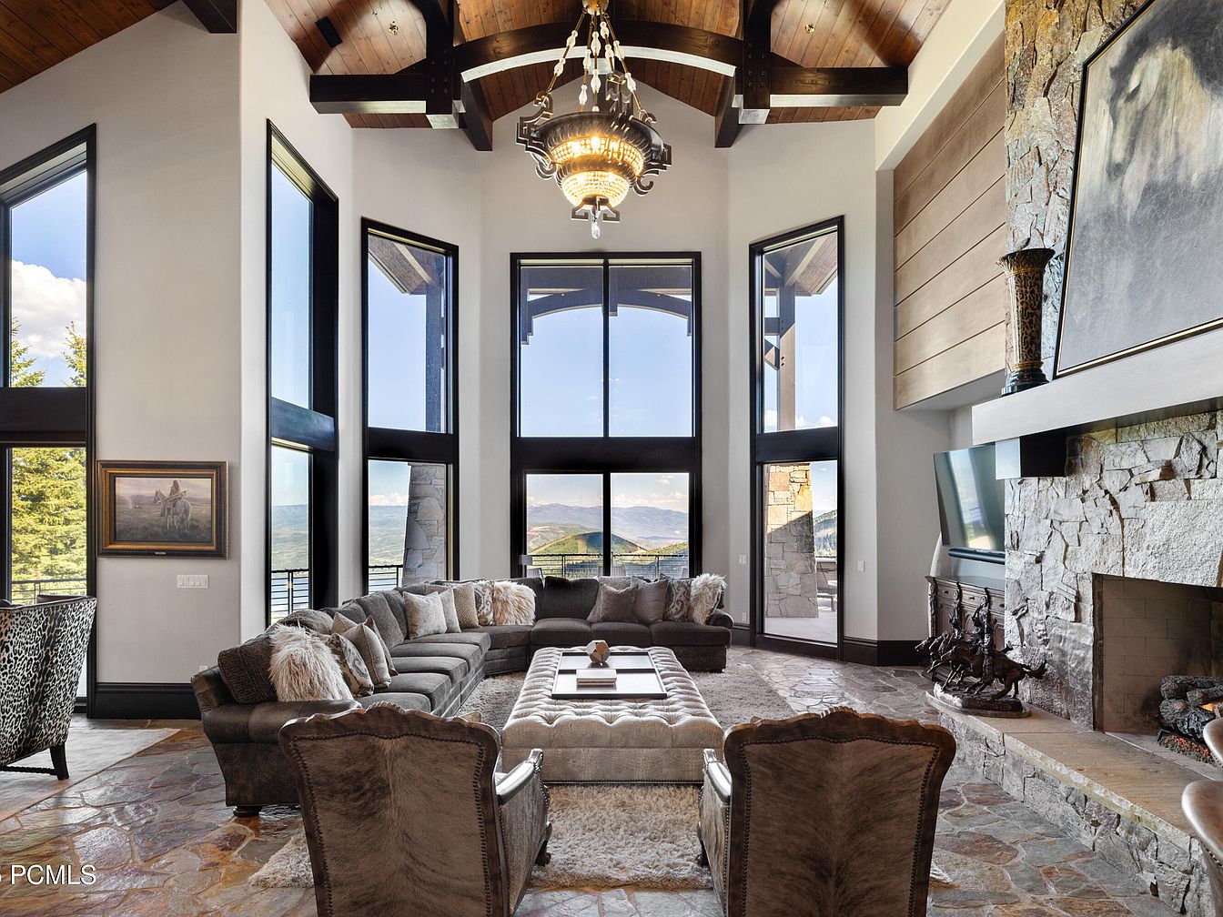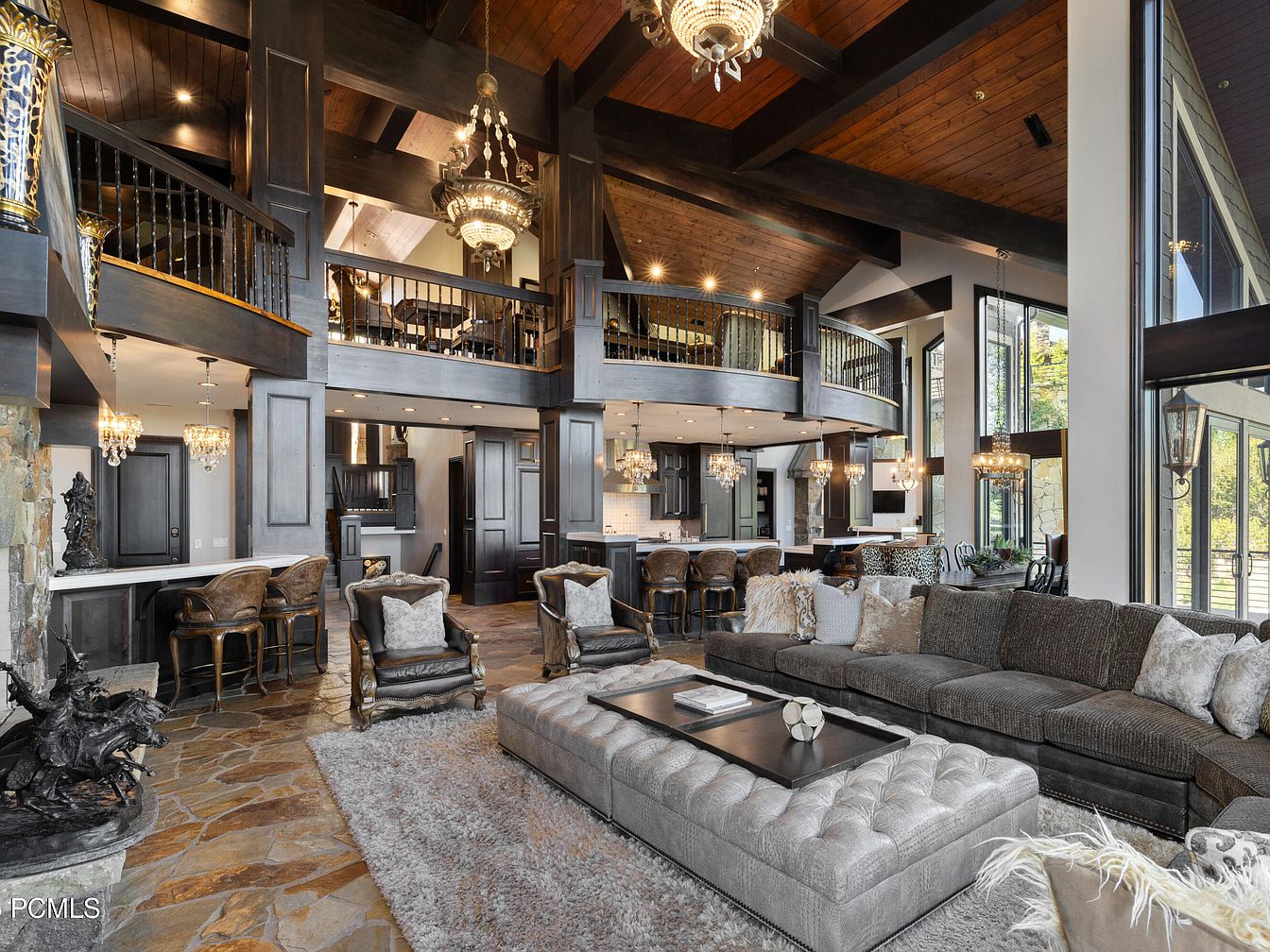 This spacious living room features a stunning open layout highlighted by soaring ceilings and expansive windows that invite natural light. The sophisticated color scheme blends rich dark tones with soft neutral hues, creating an inviting atmosphere. Elegant chandeliers hang gracefully above, complementing the rustic charm of the stone accents and wooden beams. A plush sectional sofa and tufted coffee table ensure comfort and style, perfect for family gatherings. The unique bar area offers additional seating with stylish barstools, enhancing the space’s functionality while maintaining aesthetic appeal. Cozy throw pillows and textured rugs add warmth and elegance.