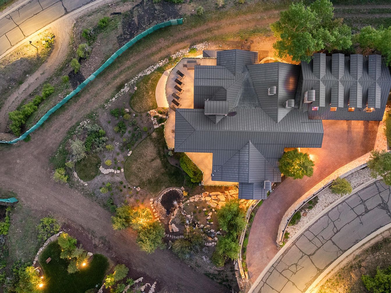 This aerial view showcases a stunning outdoor living space featuring a beautifully landscaped yard, designed for both relaxation and entertainment. The stone pathways meander through vibrant greenery, leading to a charming circular patio adorned with comfortable seating and subtle lighting, perfect for evening gatherings. The meticulously maintained gardens and natural stone accents add a rustic elegance, while the modern architectural elements of the home provide a balanced contrast. The warm color palette of the outdoor features enhances the inviting atmosphere, making it an ideal setting for family activities and social events amidst nature’s beauty.