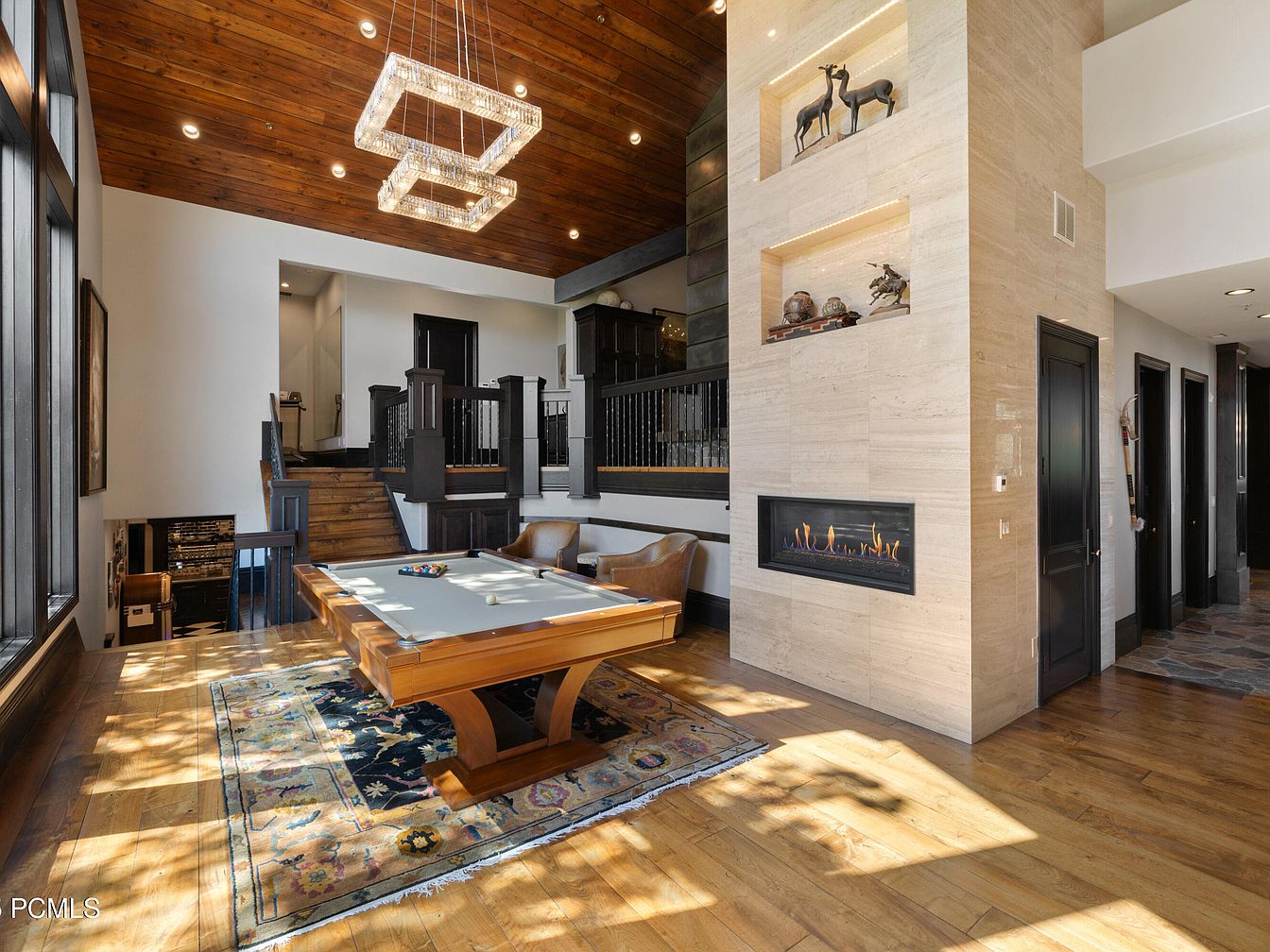 This inviting game room combines style and comfort with a warm aesthetic. A spacious layout features a modern pool table at its center, surrounded by rich wood flooring that complements the elegant wooden ceiling. The striking dual chandelier above provides ample light while adding a touch of sophistication. A sleek, contemporary fireplace in the stone feature wall serves as a cozy focal point, enhancing the room’s relaxation factor. Large windows maximize natural light, while dark accents in furniture and cabinetry create a balanced contrast against the light walls. This space is perfect for entertaining family and friends, offering both leisure and warmth.
