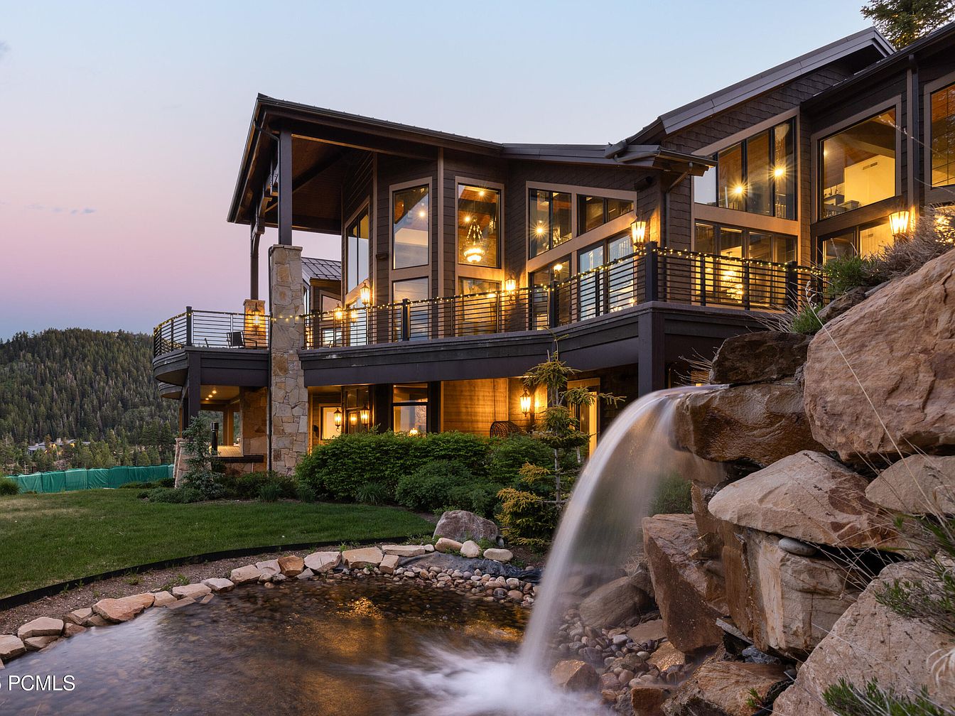 Nestled among the pines, this stunning mountain retreat features expansive glass windows that illuminate the spacious outdoor living area. The architecture combines modern design with rustic charm, showcasing a beautiful stone facade and sleek wooden accents. Soft, warm lighting creates a welcoming ambiance, while the wraparound deck provides ample space for family gatherings. Surrounded by lush landscaping and a serene water feature, the exterior fosters tranquility and relaxation. The gentle sound of flowing water alongside the carefully curated greenery enhances the family-friendly atmosphere, making it an ideal haven for both entertainment and peaceful retreats.