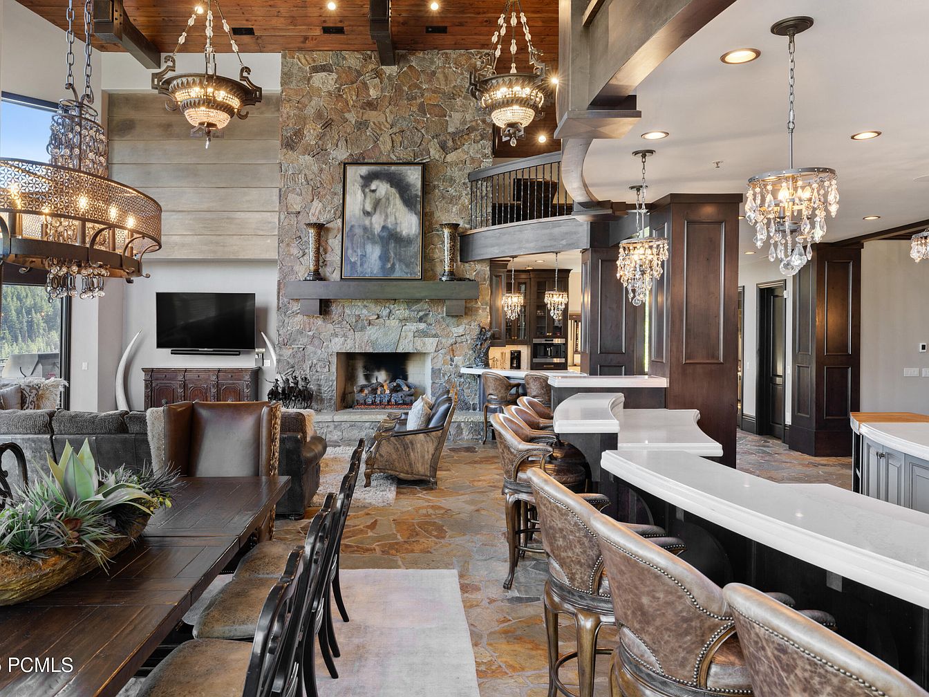 This captivating open living space seamlessly blends elegance and comfort, boasting a stunning stone fireplace as a focal point. The high wooden ceilings with exposed beams enhance the room’s grandeur, while oversized windows invite natural light and offer picturesque views of the surrounding landscape. A rich color palette of warm browns and subtle grays creates a cozy, inviting atmosphere. The spacious dining area features a large wooden table, perfect for family gatherings, surrounded by stylish metal and upholstered chairs. An island bar with chic seating enhances the entertainment experience, while delicate crystal chandeliers provide a touch of sophistication.