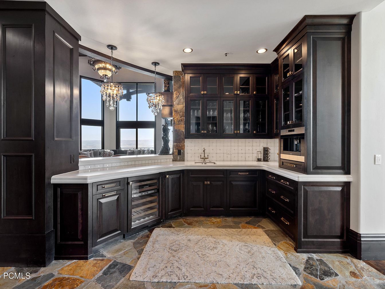 This elegant wet bar showcases rich, dark cabinetry that blends sophistication with functionality. The curved countertop offers ample surface space, ideal for entertaining guests. Beautifully designed glass-front cabinets display fine glassware, enhancing the space’s luxurious feel. The chic stone backsplash complements the polished finish of the cabinets and connects seamlessly with the slate flooring, providing an earthy yet refined aesthetic. Crystal chandeliers illuminate the area, adding a touch of glamour. Large windows welcome natural light while providing stunning views, making this wet bar perfect for both casual gatherings and formal occasions, ideal for family-friendly entertaining.