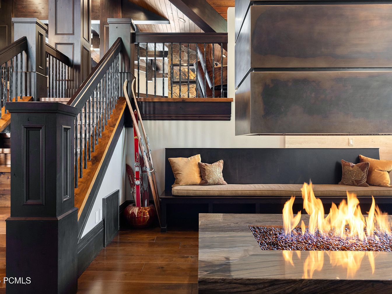 This inviting entryway seamlessly marries warmth and sophistication. Rich wood tones envelop the space, highlighted by detailed wrought iron railings that lead to upper levels. A sleek, modern fireplace takes center stage with glittering fire glass, creating a cozy atmosphere. Plush seating adorned with decorative pillows invites relaxation and conversation. The understated color palette of earthy browns and muted golds ensures a calming ambiance, while the open design promotes a family-friendly environment. Sturdy wooden stairs complement the overall aesthetic, adding character and functionality, perfect for welcoming guests into this beautifully curated home.