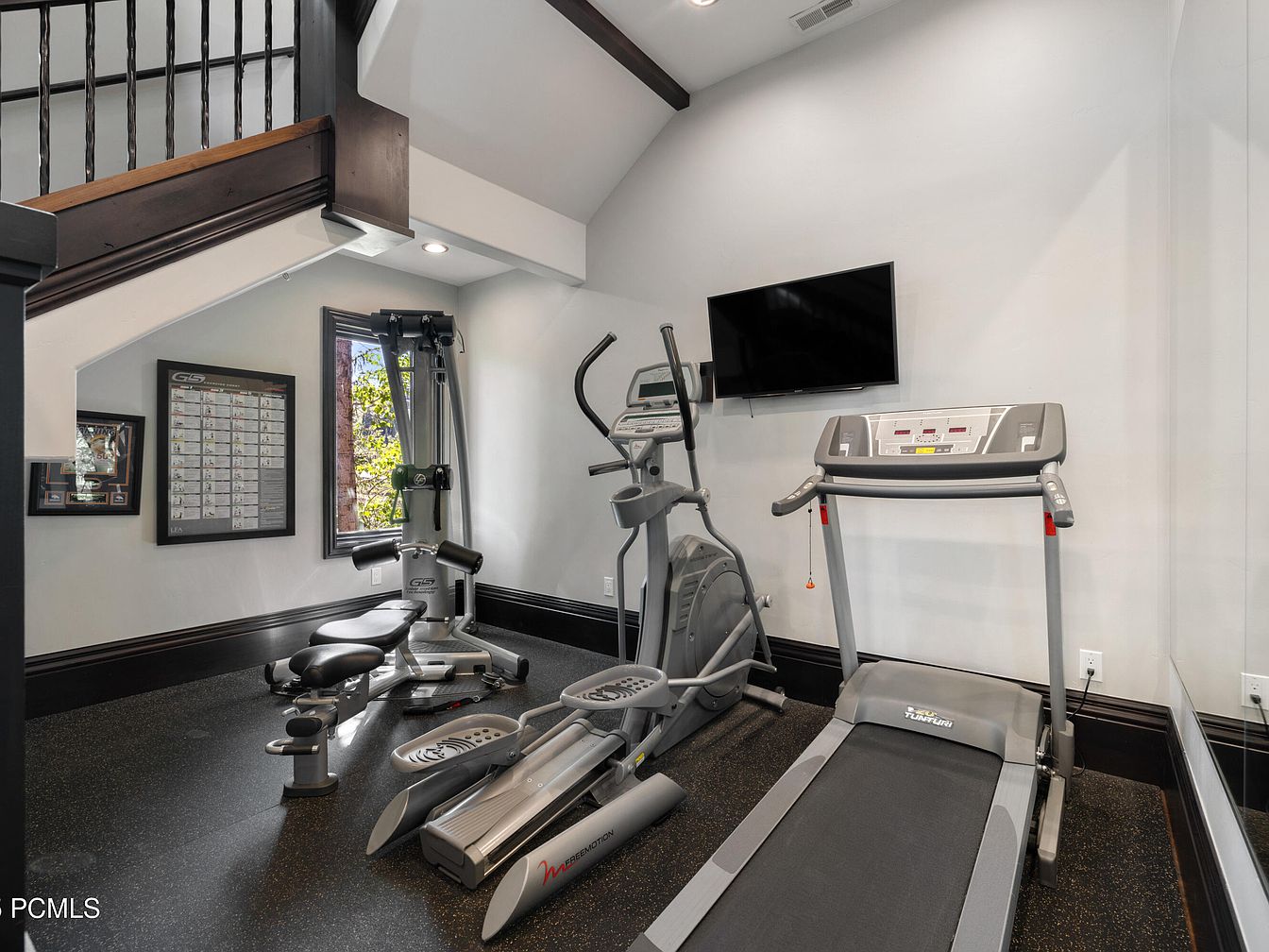 This dedicated home gym space features a sleek and modern design, ideal for fitness enthusiasts. The room showcases a blend of functionality and style, with high ceilings accentuated by dark wooden beams, creating an inviting atmosphere. Natural light filters through large windows, highlighting the contemporary exercise equipment which includes an elliptical, treadmill, and multi-gym station. A mirrored wall enhances the sense of space, while the durable, dark rubber flooring ensures a safe workout environment. With a neutral color palette of soft whites and bold blacks, this gym offers a motivational setting conducive to family fitness activities.