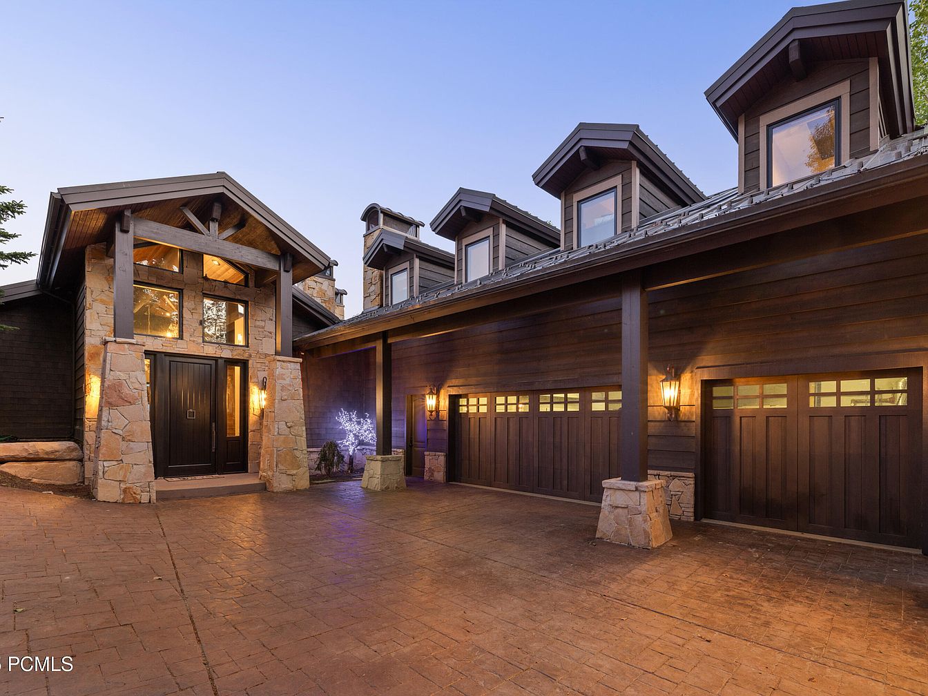 A stunning modern home exterior combines natural stone and rich wooden finishes, presenting a warm and inviting facade. The impressive entryway features a grand double door surrounded by large windows that allow natural light to flood the space. Beautiful outdoor lighting enhances the architectural details, creating an enchanting evening ambiance. The sloped roof with overhangs adds character, while the unique top windows provide interesting symmetry. An expansive driveway leads to spacious garages, showcasing functionality and style. Lush greenery surrounding the entrance adds to the home’s charm, making it a perfect family-friendly retreat.