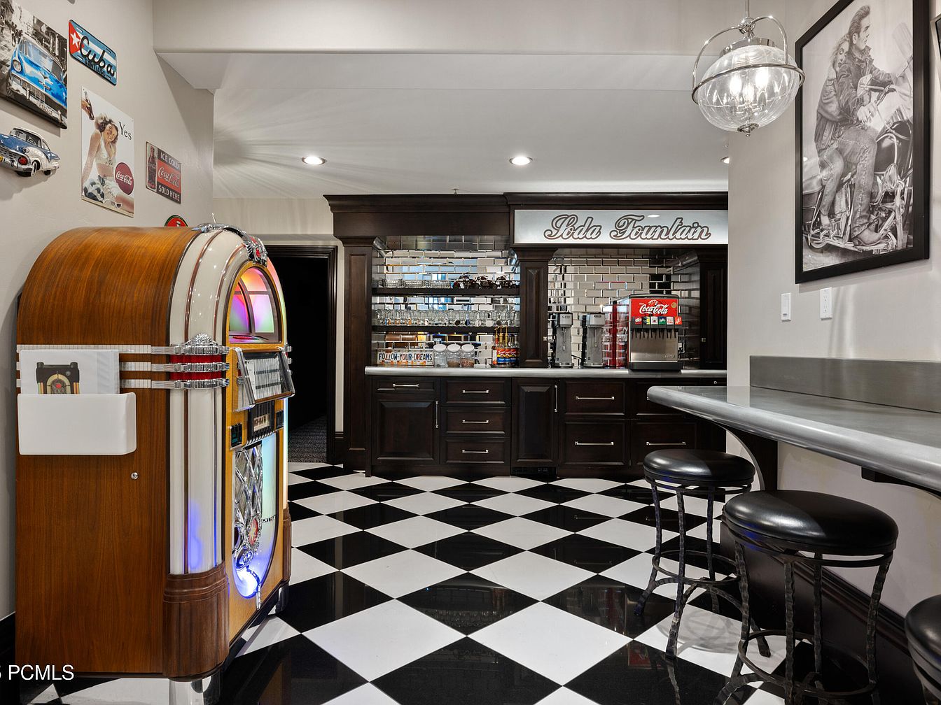 This charming retro kitchen nook seamlessly blends vintage aesthetics with modern functionality. The striking black and white checkered floor sets a playful tone, while the sleek steel countertop offers a contemporary touch. The dark cabinetry contrasts beautifully with the shimmering tile backsplash, creating an inviting atmosphere. A classic jukebox stands as a centerpiece, infusing nostalgia and fun into the space. Bar stools line the counter, perfect for family gatherings or casual meals. Eye-catching decor, including framed vintage posters, enhances the cheerful vibe, making this kitchen nook not just a place to cook but a dynamic hub for family interactions.