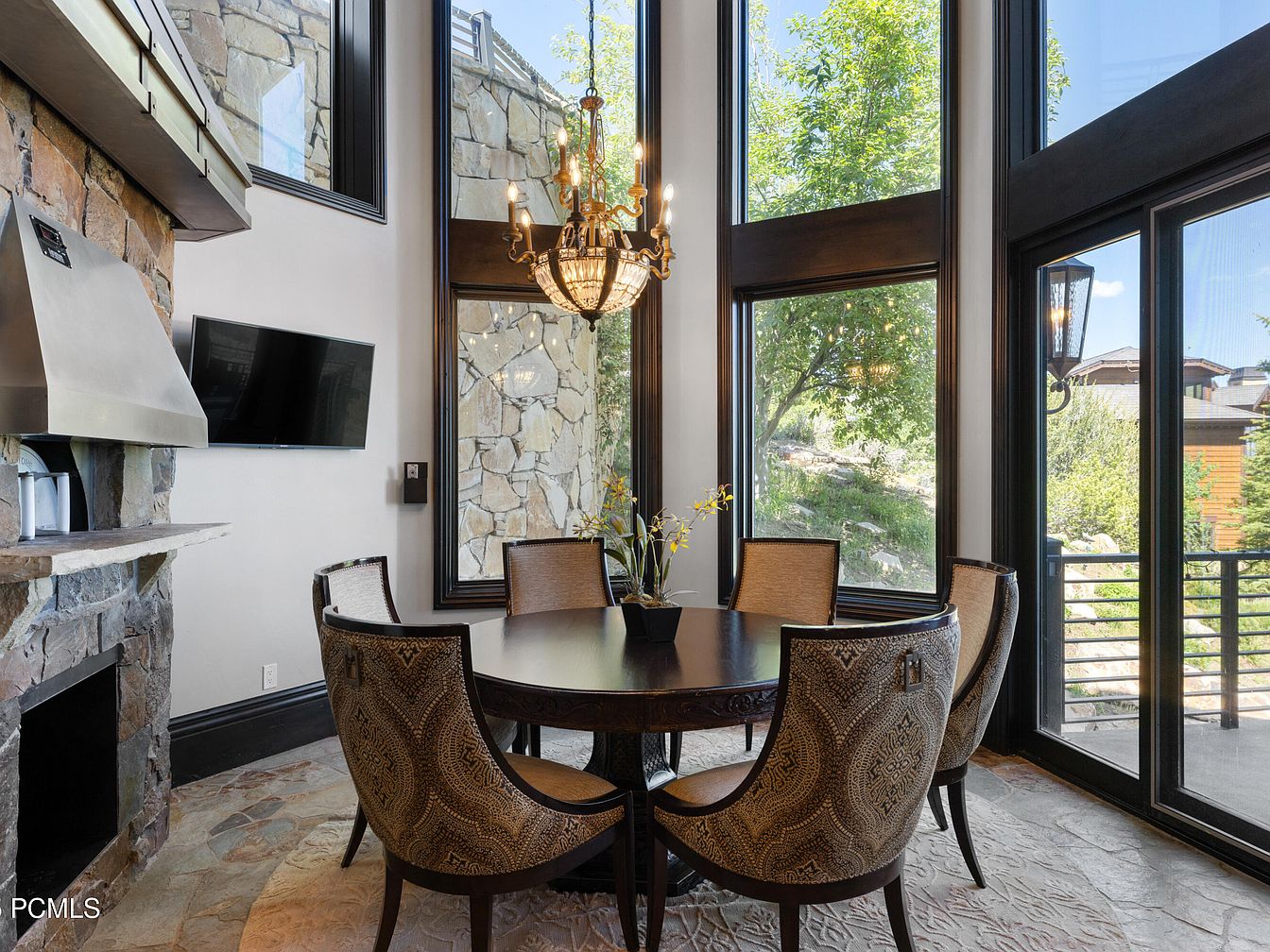 This dining area features a round table surrounded by plush, patterned chairs, creating an inviting atmosphere for family meals. The stunning floor-to-ceiling windows illuminate the space with natural light, offering stunning views of the lush greenery outside. An elegant chandelier hangs above the table, adding a touch of sophistication. A beautifully crafted stone fireplace complements the rustic charm, while modern elements like the flat-screen TV enhance functionality. The color scheme, with warm tones and earthy textures, evokes comfort, making it ideal for gatherings. Overall, it combines style and family-friendly features for memorable dining experiences.