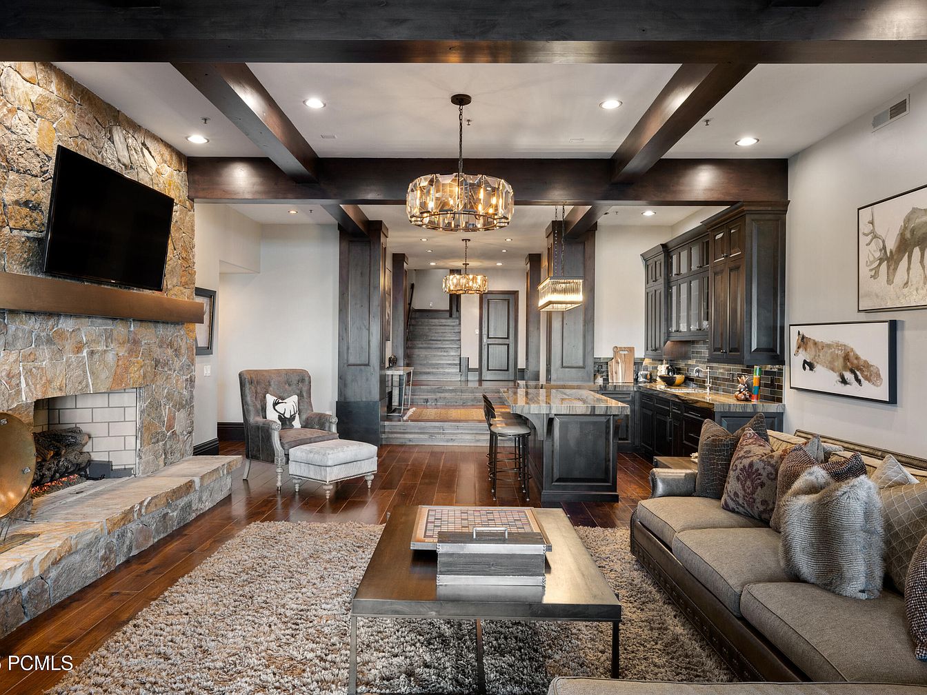 This inviting open living space seamlessly blends comfort and elegance, perfect for family gatherings. Exposed wooden beams enhance the architectural interest, while a striking stone fireplace serves as a focal point, radiating warmth. The rich color palette of deep browns and soft grays creates a cozy atmosphere. Plush seating adorned with decorative pillows invites relaxation, while a contemporary coffee table maintains functionality. The adjoining kitchen showcases sleek dark cabinetry paired with shimmering countertops, providing ample space for culinary adventures. Stylish light fixtures illuminate the area, ensuring a bright yet intimate ambiance, ideal for both entertaining and everyday living.