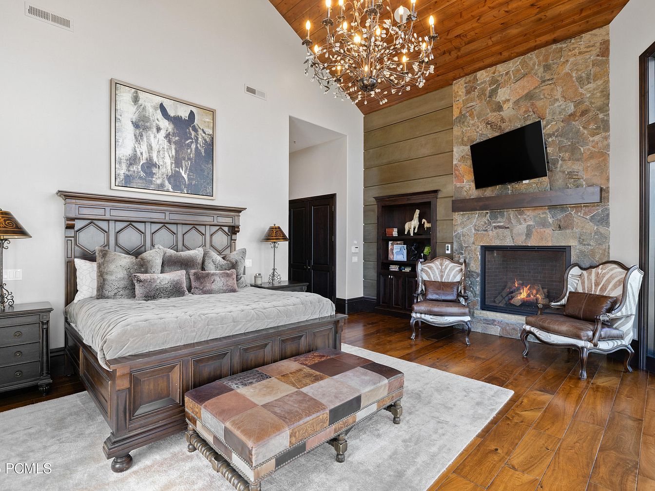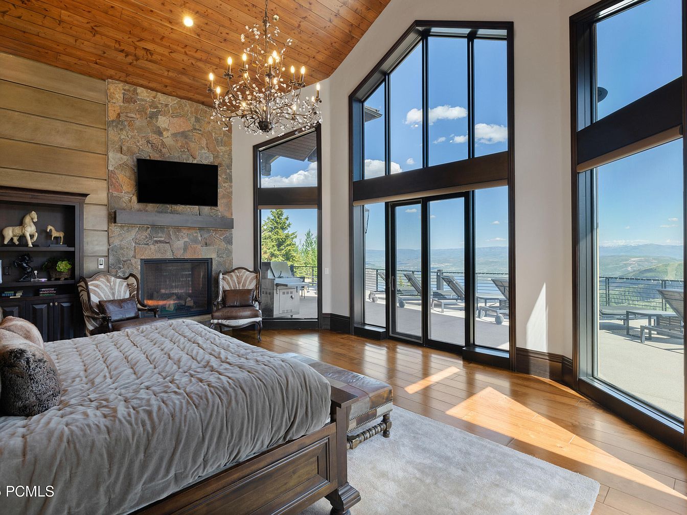 A spacious master bedroom features an inviting layout accentuated by vaulted ceilings and rich wooden beams that create warmth. Large floor-to-ceiling windows frame breathtaking views, flooding the space with natural light and connecting indoors with the outdoors. The stylish stone fireplace serves as a focal point, providing a cozy ambiance. Plush bedding and elegant furnishings ensure comfort, while the soft color palette of earthy tones enhances tranquility. A seating area with classic armchairs invites relaxation, making this space perfect for unwinding. Thoughtfully designed, it blends modern luxury with rustic charm, providing a welcoming haven for family and friends.