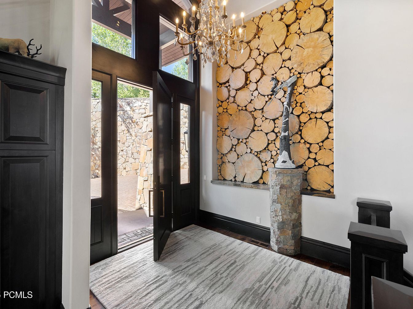 An inviting entryway features a dramatic double-door entrance, welcoming visitors with expansive windows that flood the space with natural light. The striking wall of stacked wooden logs adds rustic charm, while a stylish stone pillar showcases an elegant sculpture, enhancing the room’s artistic appeal. Simplistic dark cabinetry is complemented by a soft, neutral area rug, grounding the aesthetic palette. The contrast of dark and light tones in furnishings creates a cozy yet sophisticated ambiance. A beautiful chandelier overhead adds a touch of luxury, perfectly balancing the earthy elements, making this entryway a warm, family-friendly space.