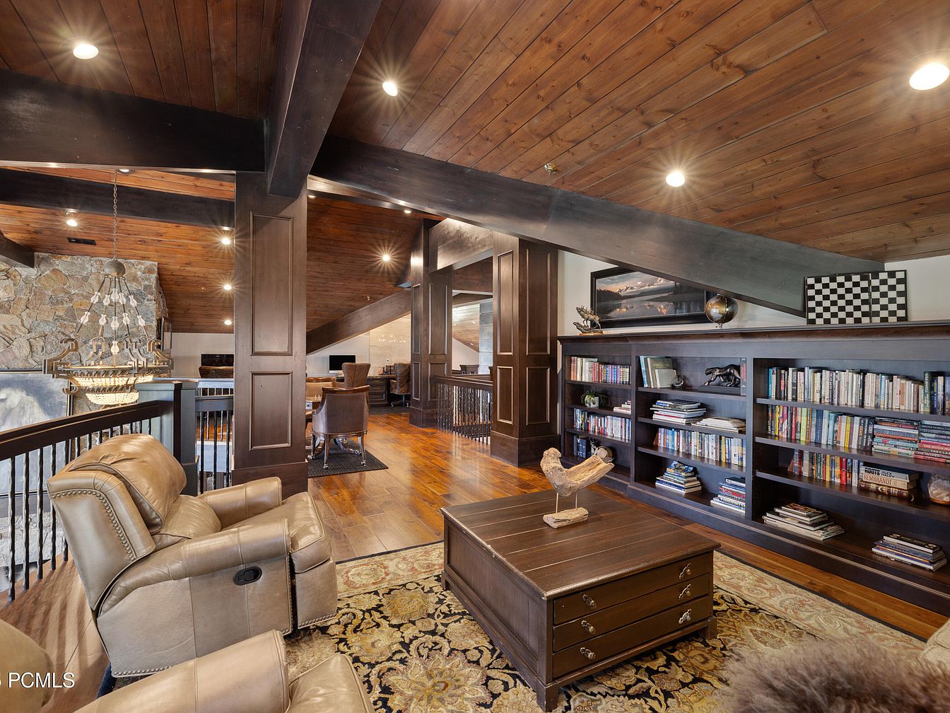 This inviting family living space features a stunning high ceiling accented with rustic wooden beams, creating a warm and cozy atmosphere. The rich tones of the hardwood flooring complement the elegant furnishings, including plush reclining chairs and a stylish coffee table with intricate detailing. A grand stone fireplace serves as a focal point, enhanced by soft overhead lighting that brightens the area. Bookshelves lined with books and decor add a personal touch, while a relaxing area rug ties the space together. This room perfectly blends comfort and sophistication, ideal for family gatherings and leisure time.