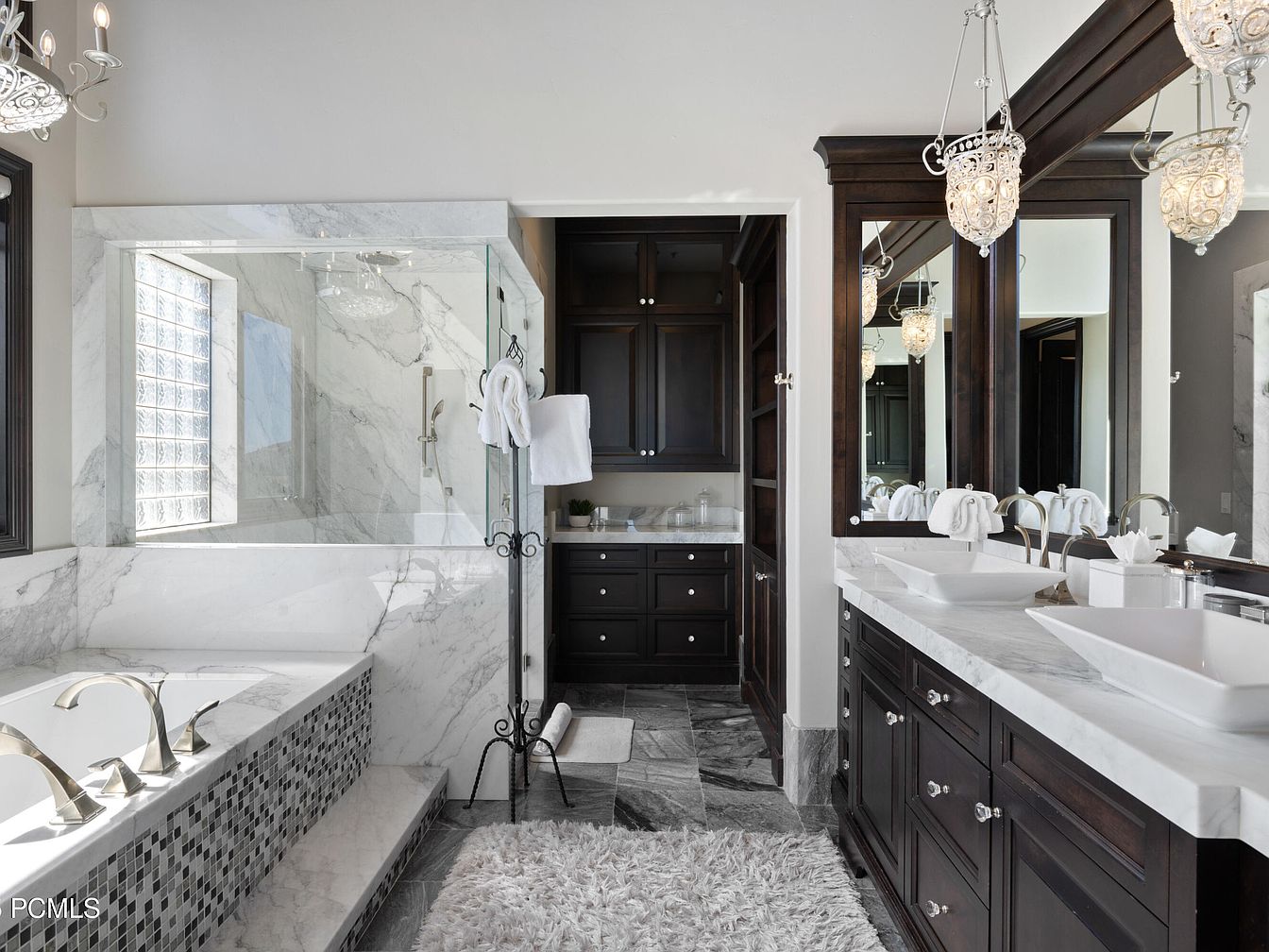 This luxurious master bathroom features a spacious layout that combines elegance with functionality. The sleek marble walls and flooring create a timeless appeal, while the intricately designed chandelier adds a touch of sophisticated charm. Dual vanities with minimalist vessel sinks provide ample space for everyday routines, complemented by polished chrome fixtures. An inviting soaking tub, surrounded by detailed mosaic tiling, offers a perfect retreat for relaxation. The glass-enclosed shower showcases modern design elements, ensuring both style and accessibility. Rich dark cabinetry contrasts beautifully with the light color palette, elevating the serene ambiance, making it a fantastic space for family living.