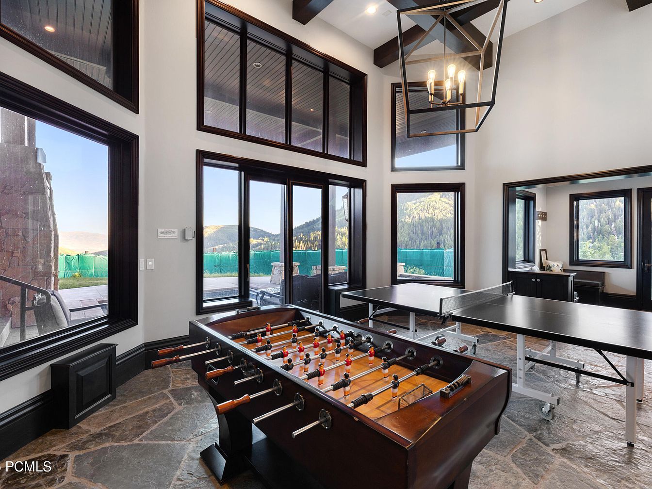 This game room features an inviting layout with a playful atmosphere, perfect for family gatherings. The focal point is a stylish foosball table, surrounded by natural light streaming through expansive windows that frame stunning mountain views. Rich dark wood accents contrast beautifully with the stone flooring, adding warmth to the space. A sleek ping pong table offers additional entertainment options, while a contemporary light fixture hangs above, enhancing the modern aesthetic. The walls are painted in soft neutral tones, allowing the vibrant game elements to stand out, creating a delightful area for relaxation and fun.