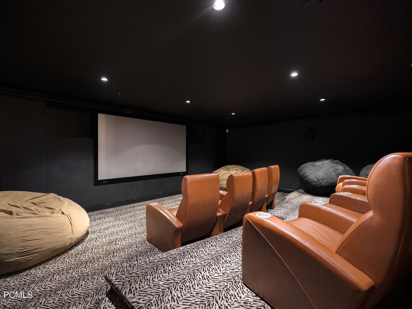 This sophisticated home theater boasts a cozy, intimate layout designed for ultimate entertainment. The plush, brown leather recliners provide comfort and style, while strategically placed bean bags add a relaxed vibe for informal gatherings. A large, wall-mounted screen stands ready for movie nights, complemented by sleek sound equipment tucked discreetly in the walls. The dark color scheme enhances the cinematic experience, with subtle lighting accents spotlighting the unique zebra-striped carpet. This inviting space caters to families and friends alike, offering a perfect blend of luxury and comfort for immersive viewing experiences.