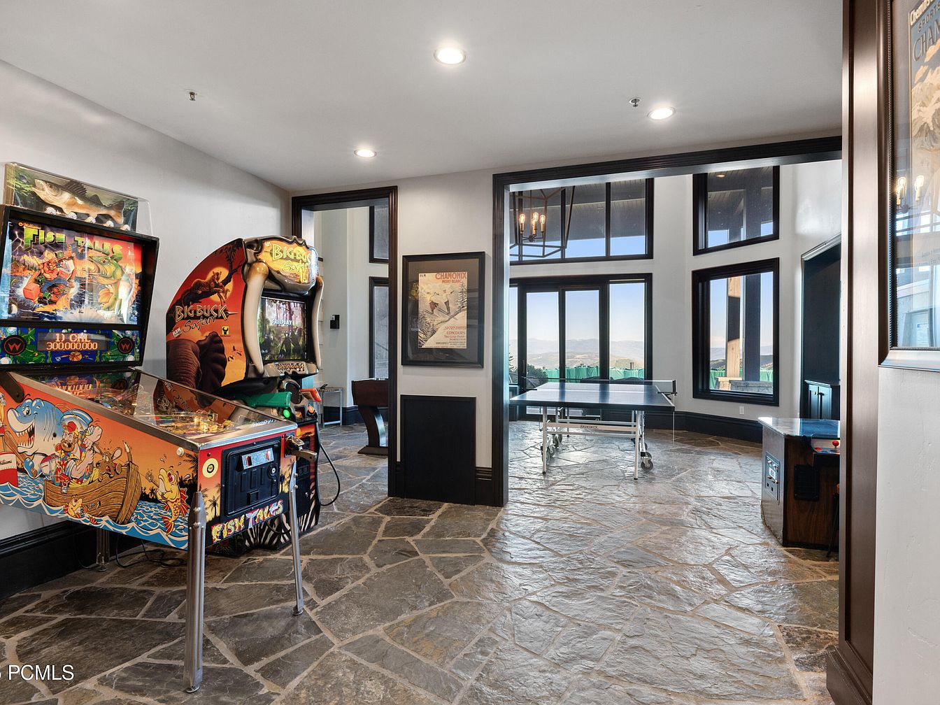 This vibrant game room exudes a sense of fun and leisure, making it an inviting space for family gatherings and entertainment. Featuring classic arcade games alongside a sleek ping pong table, the layout cleverly balances active recreation with relaxed lounging. The room is adorned with expansive windows that flood the space with natural light, highlighting the unique stone flooring and dark wooden accents that add sophistication. Warm neutral tones complement the playful decor, creating an inviting atmosphere. This space not only encourages interaction and enjoyment but also provides stunning views for a scenic backdrop.