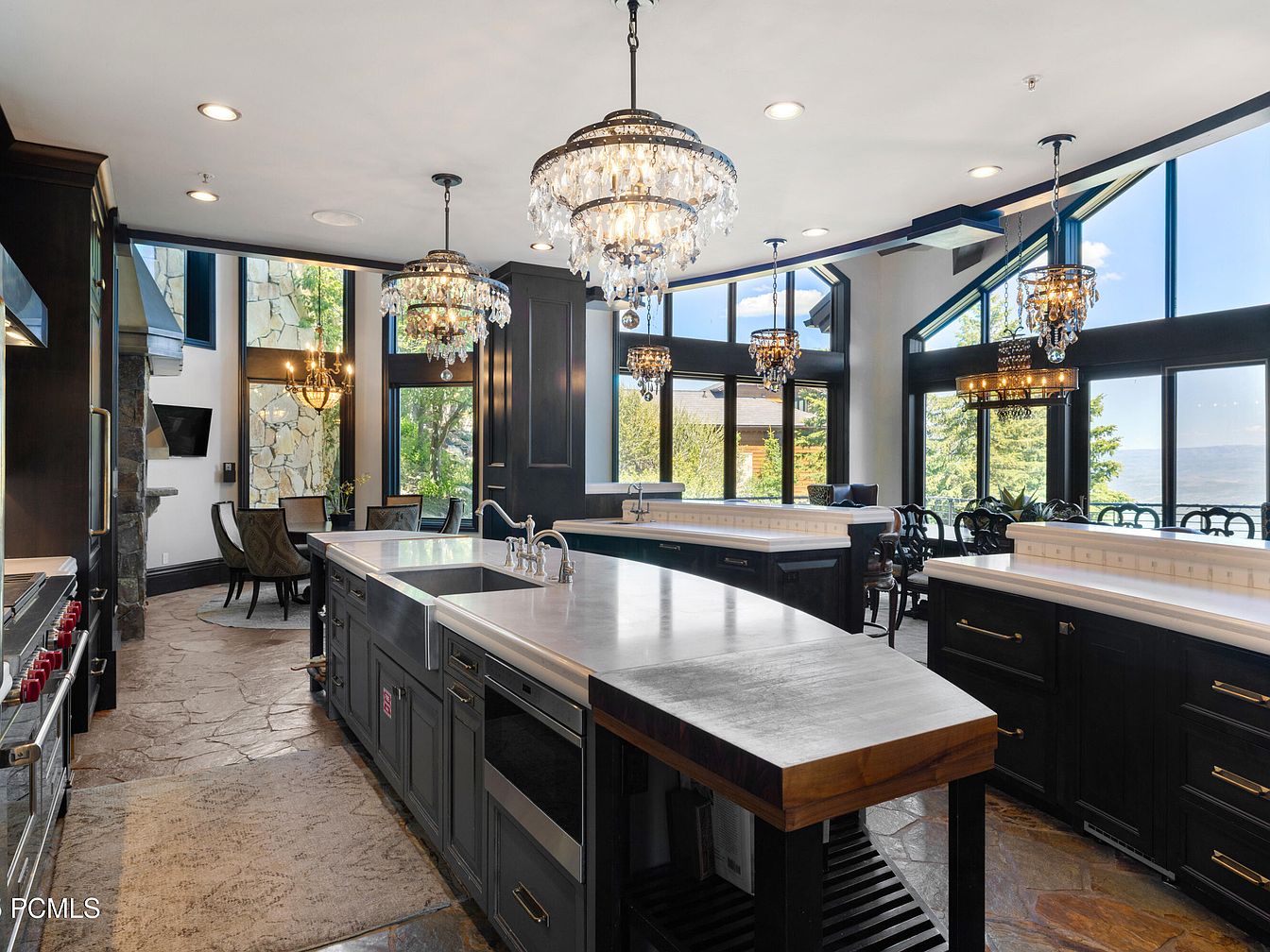 A stunning gourmet kitchen designed for both elegance and functionality. This space features an expansive island with a rich wooden countertop, perfect for meal prep and casual dining. Sleek black cabinetry pairs beautifully with white marble accents, creating a striking contrast. Large, floor-to-ceiling windows invite natural light, offering breathtaking views and highlighting the high ceilings. Crystal chandeliers add a touch of sophistication, while a cozy dining nook establishes a family-friendly atmosphere. The stone-tiled flooring provides durability, while modern appliances ensure a seamless cooking experience, making this kitchen the ideal hub for gatherings and culinary adventures.
