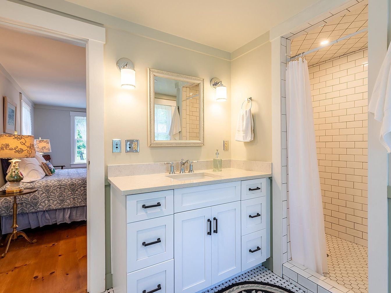 A bright and inviting bathroom features a sleek white vanity with shaker-style cabinetry, topped with a polished stone countertop. The double wall sconces flanking the framed mirror provide soft, even lighting, creating a calming atmosphere. Subtle pale wall colors blend with the crisp tiles of the walk-in shower, which boasts glossy subway tiles and a simple white curtain for privacy. Flooring in classic black-and-white mosaic tile adds timeless charm, while abundant countertop space and storage drawers make it highly functional for family use. Through a wide doorway, a glimpse of a cozy, well-lit bedroom hints at a seamless, family-friendly layout.
