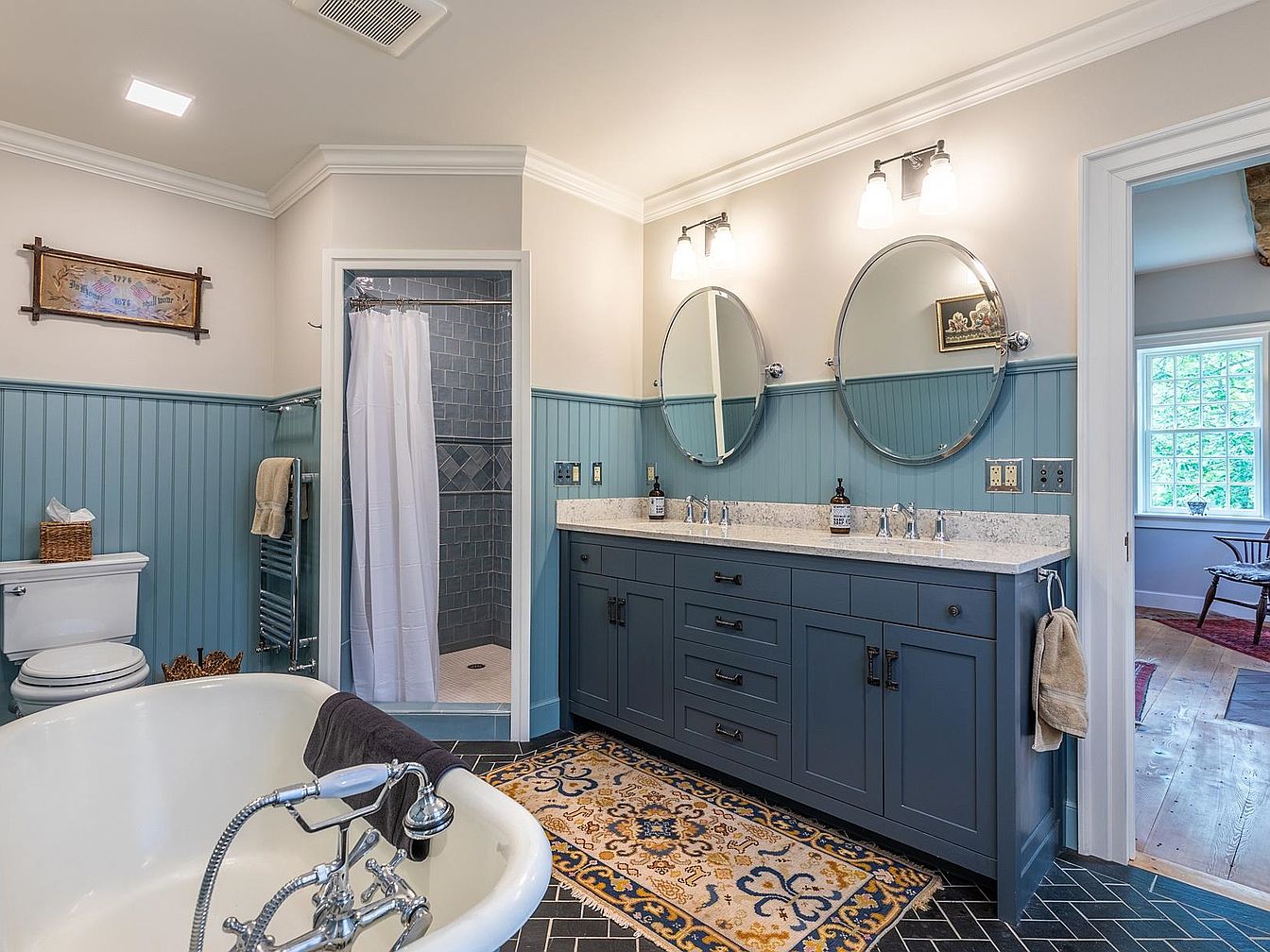 A beautifully designed bathroom, featuring a double-sink vanity with deep blue cabinetry and polished hardware, perfect for a busy family. Circular mirrors and classic sconce lighting add elegance, while beadboard wainscoting in soft blue creates a calming, cottage-inspired ambiance. The black herringbone tile floor contrasts nicely with creamy walls and white crown molding, delivering a timeless look. A freestanding tub with vintage fixtures enhances relaxation potential. The space is welcoming and functional, with thoughtful storage and an open shower. Pops of color from the decorative rug and wall art give the room personality, making it stylish yet practical for everyday living.