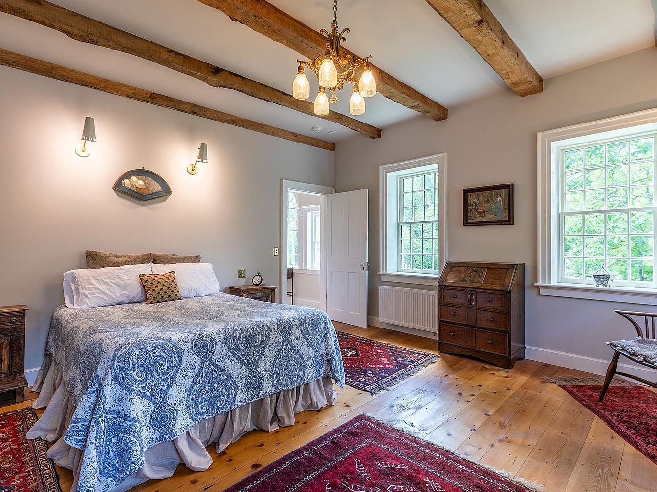 This spacious bedroom features warm wooden floors accented by bold, traditional red rugs, creating a comfortable and inviting ambiance. Natural light pours in through large double-pane windows, highlighting the exposed wooden ceiling beams that add a touch of rustic elegance. The room’s soft beige walls pair harmoniously with the calming blue patterned bedspread and neutral-toned bedding, offering a restful atmosphere. Tasteful touches like the vintage writing desk, cozy side tables, and classic chandelier lend charm and practicality. Ample floor space and durable furnishings make this bedroom ideal for families, promoting a sense of warmth, serenity, and timeless style.
