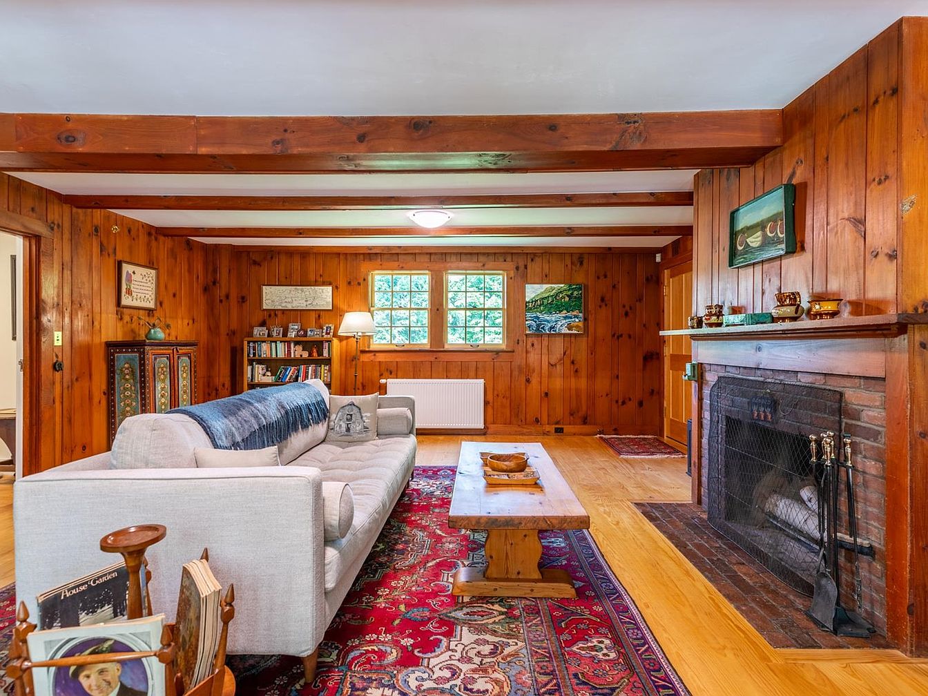 Warm knotty pine wood paneling and exposed beams give this living room a classic, inviting cabin feel. An expansive brick fireplace anchors the room, surrounded by personal touches like framed photos, stacked books, and eclectic decorative pieces. The comfortable, neutral-toned sofa provides ample seating, while the rich red patterned area rug brings vivid color and ties the space together. Large windows let in natural light, enhancing the golden hues of the wood. Family-friendly details include a sturdy coffee table for gatherings, a reading nook, and accessible shelving for books and games, making this space perfect for relaxing evenings together.