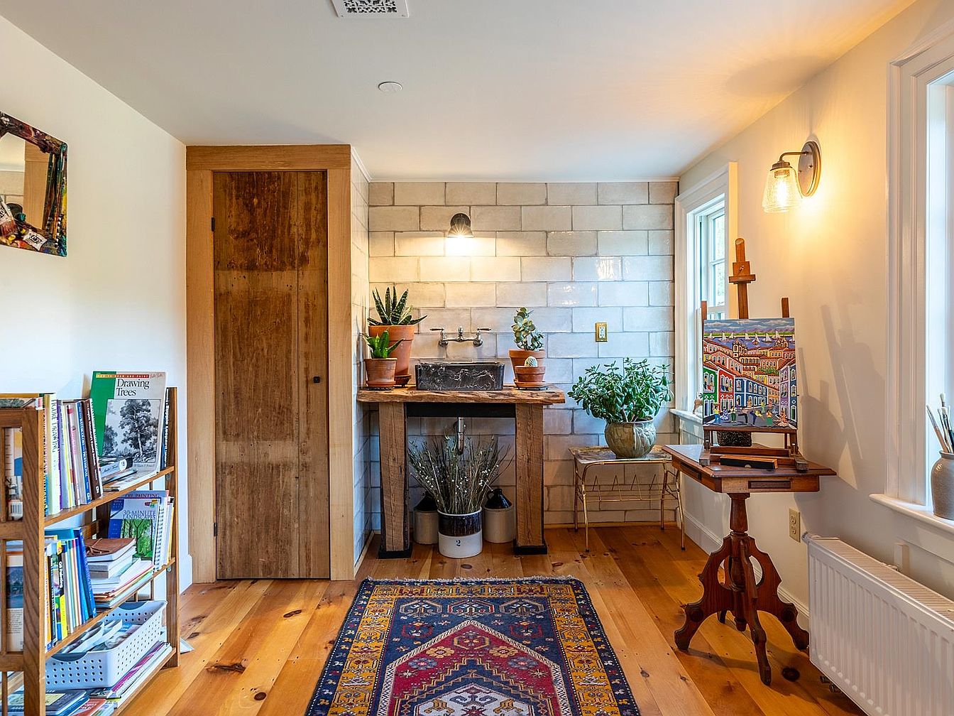 This inviting art studio corner exudes warmth and creativity, featuring natural wood floors and a large handwoven rug at the center, providing comfort and a pop of color. The workspace includes an easel with a vibrant painting in progress, positioned wonderfully to catch daylight from the windows. A rustic wooden sink and planter station adds charm, while potted greenery brightens the space. Open shelving displays a thoughtfully organized collection of art books and supplies, perfect for family art sessions. The soft cream walls and gentle lighting create a tranquil backdrop, making this a family-friendly haven for artistic inspiration.