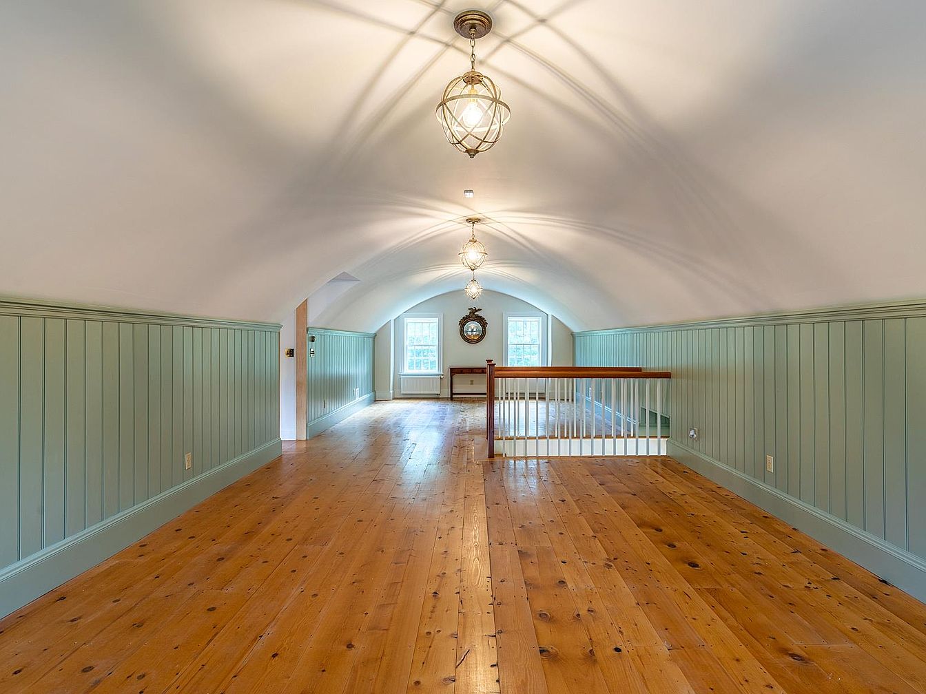 A spacious loft hallway exudes charm with its vaulted ceiling and soft sage-green wainscotting. The beautifully finished, wide-plank wooden floors add natural warmth and character, making this area versatile for family activities or as a quiet reading nook. Two large windows flood the space with daylight, creating a bright and welcoming atmosphere. Stylish pendant lights cast unique patterns across the arched ceiling, enhancing the cozy ambiance. Safety rails ensure family friendliness, especially for children. This thoughtfully designed space is perfect for showcasing artwork, setting up study spots, or offering an open play area, all while maintaining elegant simplicity.