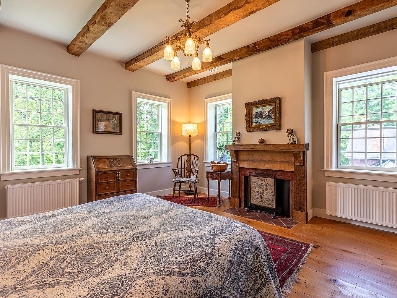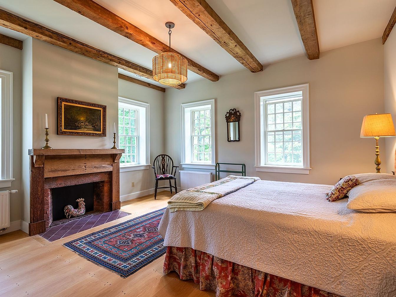 A spacious, sunlit bedroom featuring exposed wooden ceiling beams and large windows that flood the room with natural light. The earthy palette is complemented by a rustic wood fireplace and an elegant area rug, creating a warm, inviting atmosphere. The neatly made bed with a textured white quilt is perfect for families or guests, offering comfort and coziness. Tasteful decor, including a classic framed painting, antique chair, and brass candlesticks, enhances the room’s timeless style. Simple furnishings and clean lines ensure the space feels uncluttered and peaceful, ideal for relaxation and quiet family moments.