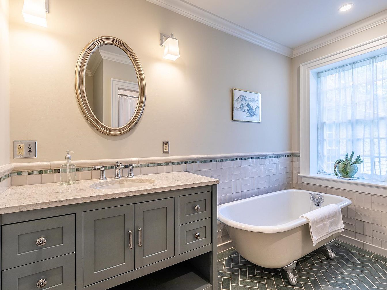 This bathroom blends classic elegance with modern family-friendly comfort. Soft neutral walls pair seamlessly with white subway tile and a subtle mosaic border, giving the space a light, airy feel. The freestanding clawfoot tub invites relaxation, while a pale gray vanity with a marble countertop adds sophistication and plenty of storage. Natural light streams through a large window with delicate sheer curtains, illuminating both the functional and decorative elements—like the oval mirror and small potted plant. Durable flooring is both practical for busy family use and visually appealing, ensuring this bathroom feels welcoming for all ages.