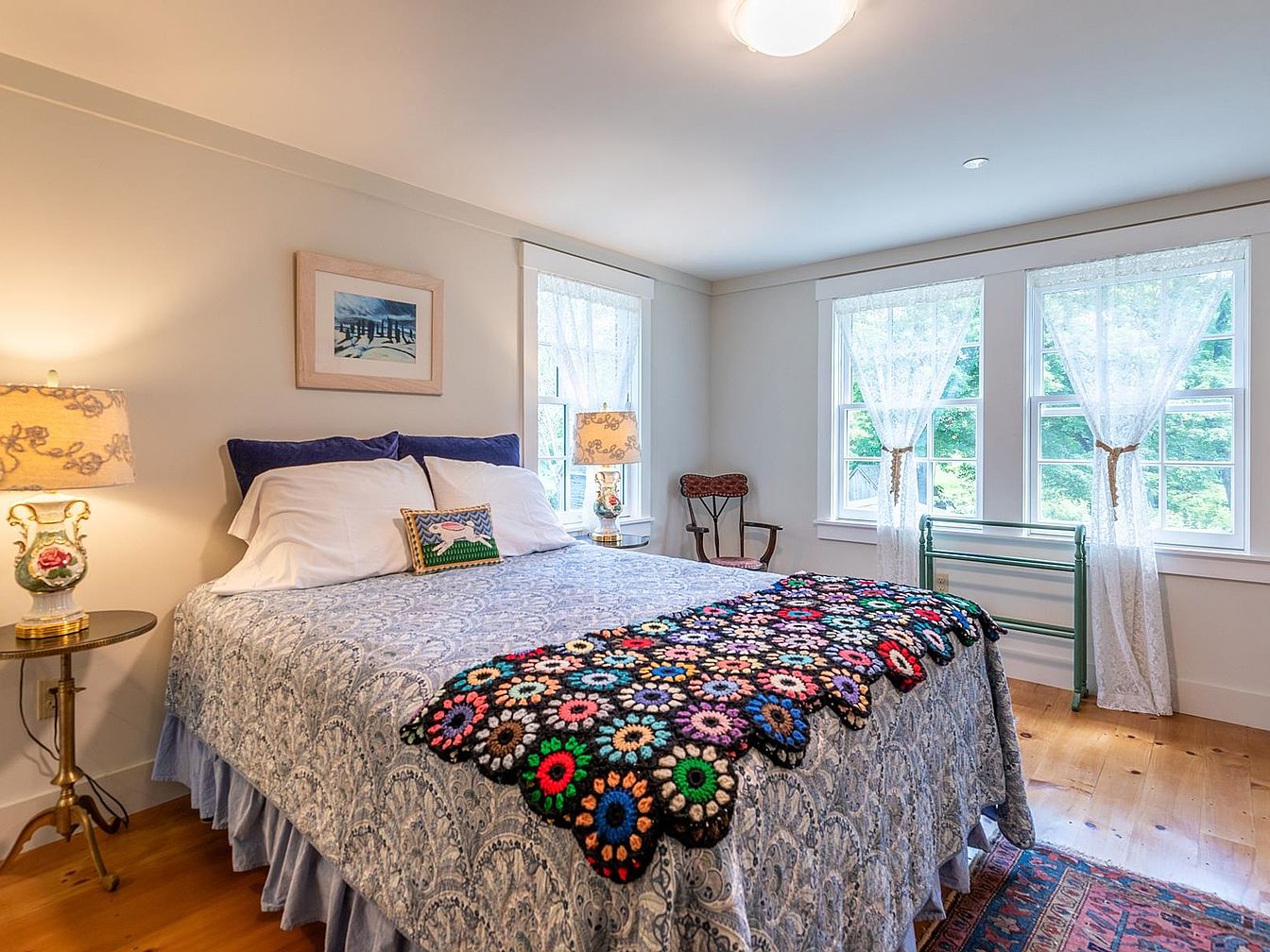 Bright and inviting, this bedroom features large windows draped with sheer lace curtains that let in abundant natural light, creating a warm and peaceful ambiance. The bed is elegantly dressed in patterned blue bedding and topped with a colorful crocheted throw, bringing a touch of handcrafted charm. Floral lamps and a small, whimsical pillow add personality, while a classic wooden chair and vintage rug enhance the homely atmosphere. The soft cream walls and polished wood floors pair seamlessly, making the space both timeless and family friendly, ideal for relaxation and quiet moments together. Subtle artwork completes the serene setting.