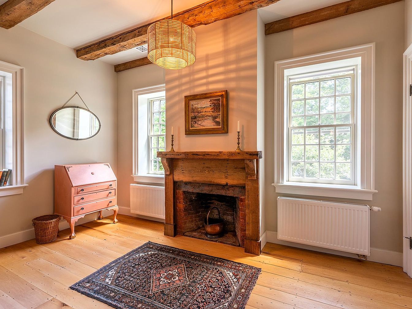 Warm natural light pours through dual paned windows, illuminating a cozy sitting area centered by a rustic wooden fireplace. The exposed wood ceiling beams and honey-toned hardwood floors evoke classic charm, while neutral wall colors create a soft backdrop. A woven pendant lamp casts an inviting glow above, offering comfort for family gatherings. The space is accented with a Persian-style rug and a vintage secretary desk in blush hues, making it functional for reading or homework. Framed art, an oval mirror, and minimal décor add a homely touch, making this space both stylish and family-friendly.