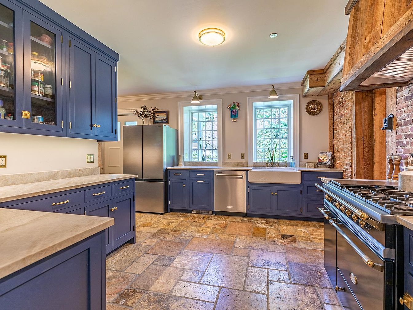 A welcoming kitchen combines rustic charm with modern convenience, featuring deep blue cabinetry accented by brass hardware. Natural stone countertops offer ample space for meal prep and family activities, while exposed brick walls and wooden ceiling beams add warmth and character. The farmhouse sink, set beneath twin paneled windows, allows for plenty of natural light, making the space feel even more inviting. Family-friendly details include easy-to-clean tile flooring and sturdy cabinetry for organized storage. Stainless steel appliances, including a spacious fridge and dual-oven range, balance the traditional elements, creating an ideal heart of the home for gatherings and daily living.
