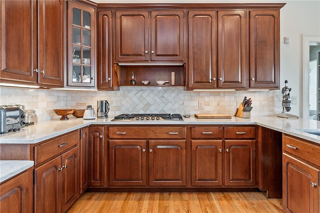 Warm cherry wood cabinetry anchors this inviting kitchen, providing abundant storage and a classic, timeless appeal. The design features a spacious L-shaped countertop in soft, polished stone, ideal for meal prepping or family gatherings. A herringbone-patterned tile backsplash adds subtle visual interest, while glass-fronted cabinets offer elegant display for dining ware. Stainless steel appliances and modern hardware bring practicality and style. Ample counter space, a safe gas cooktop, and organized knife storage contribute to a family-friendly environment, making it easy for multiple people to work together comfortably. Soft neutral tones balance the rich wood, enhancing the kitchen’s welcoming atmosphere.