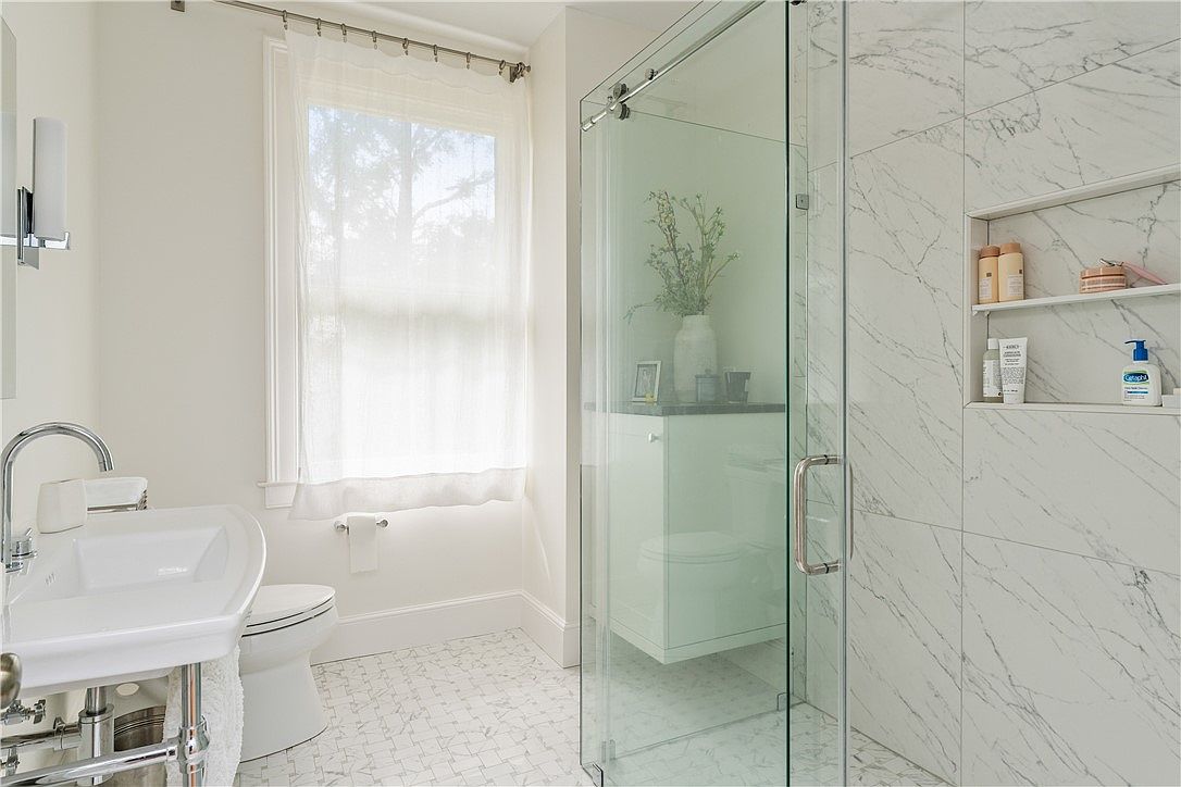 A serene bathroom featuring a spacious glass-enclosed shower with sleek marble tiles that extend from floor to ceiling, offering a luxe, spa-like ambiance. The light-filled space is framed by a window covered in airy sheer curtains, diffusing natural sunlight and enhancing the fresh, clean palette of whites and soft grays. A pedestal sink and modern fixtures complement the mosaic tile floor, while built-in shelving in the shower creates convenient storage for toiletries. This layout makes the room both functional and family friendly, allowing for easy cleaning and safe, slip-resistant tile. Subtle decorative touches, such as a vase of greenery, add personality and warmth.