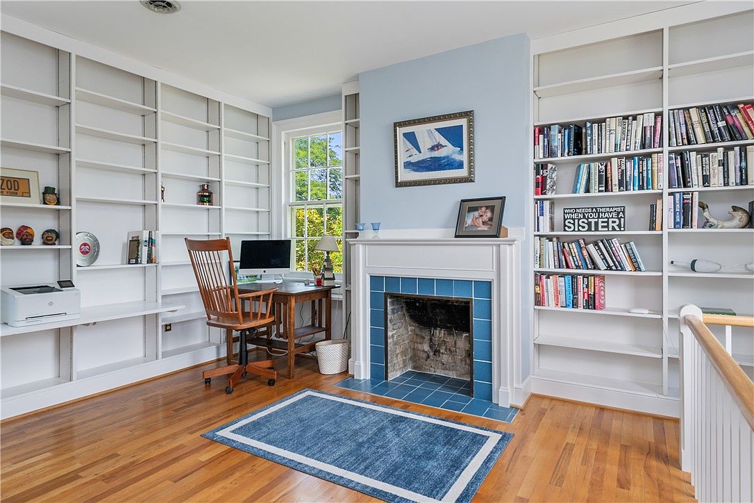 This inviting home office library boasts bright natural light streaming through a large window, illuminating the spacious layout. Crisp white built-in bookshelves frame a cozy blue-tiled fireplace, offering both display and storage for an impressive collection of books and family mementos. Warm hardwood floors are softened by a blue area rug, creating a cozy and family-friendly atmosphere ideal for reading or working from home. A traditional wooden desk and chair add classic charm, while a sleek computer setup modernizes the space. The calming pastel blue wall and tasteful décor make this an inspiring, practical retreat for the whole family.