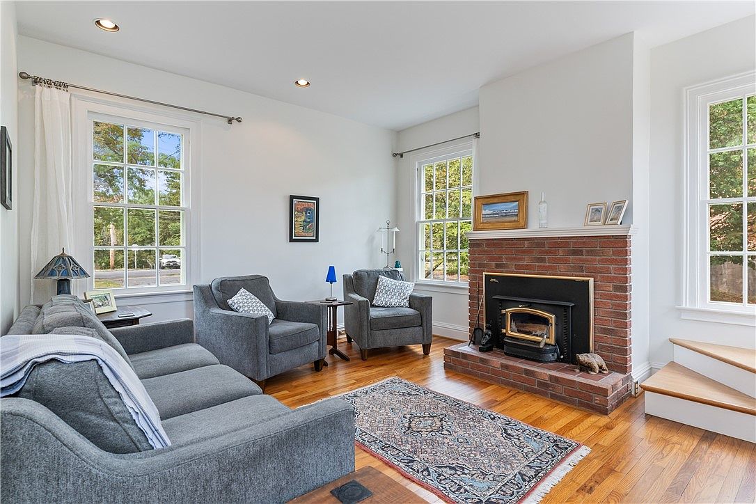 A cozy living room centers around a classic brick fireplace, ideal for family gatherings or quiet evenings. Natural light streams through large, traditional windows, brightening the soft gray furnishings and enhancing the airy atmosphere. Hardwood floors add warmth, while a patterned area rug provides a touch of elegance and comfort underfoot. Simple white walls and tasteful art create a clean backdrop that feels both modern and timeless. The arrangement of plush chairs and a sofa promotes conversation, with accent tables for added convenience. This inviting space balances style with functionality, making it suitable for families and guests alike.