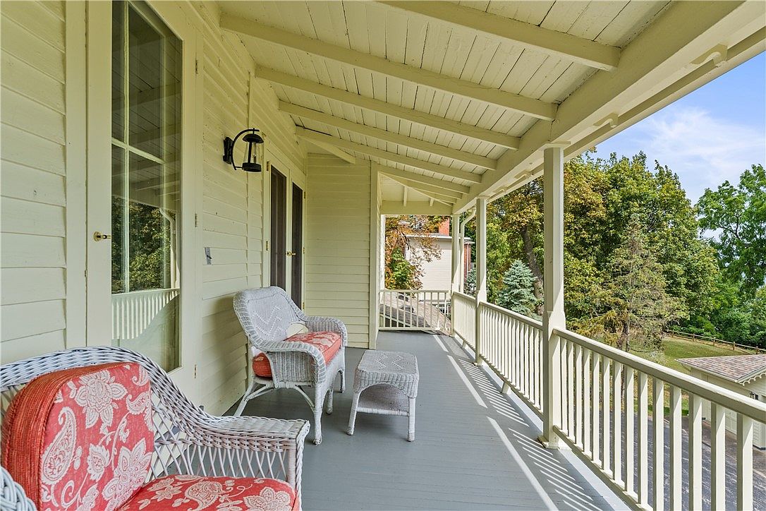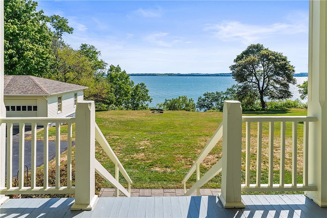 Step onto a classic porch boasting painted wood railings and gentle steps, perfectly framing a breathtaking waterfront landscape. The outdoor space welcomes family gatherings, with a spacious green lawn ideal for children to play and adults to relax. Nestled beside mature trees and a charming detached garage, the porch’s soft cream and light blue hues create an inviting, serene feel. Architectural details like wide newel posts and open sightlines maximize the panoramic lake view, offering a peaceful retreat. This area seamlessly blends nature with home comfort, making it perfect for outdoor living, socializing, or soaking up tranquil sunsets.