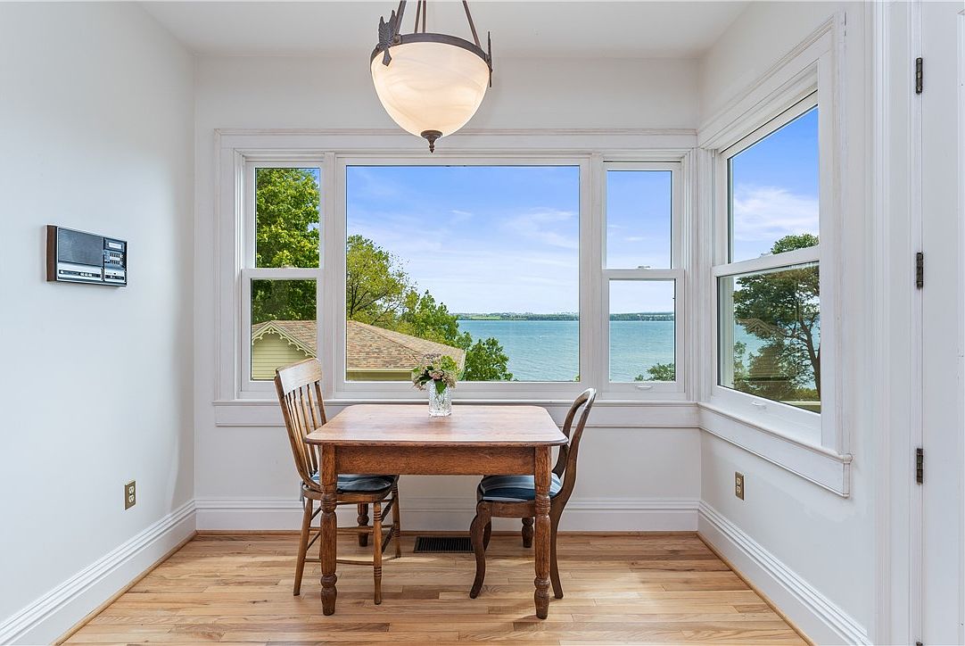 A charming breakfast nook is bathed in natural light from expansive corner windows that frame a serene lake and lush treetops. The light oak hardwood floor adds warmth, while crisp white walls and crown molding keep the space open and bright, ideal for family mornings or intimate meals. A solid wood table with classic spindle-back chairs sits beneath an elegant pendant light. The uncluttered layout provides ample space for children or guests to move comfortably, and the built-in wall radio offers modern convenience. Simple, fresh flowers on the table complete this peaceful, family-friendly setting.
