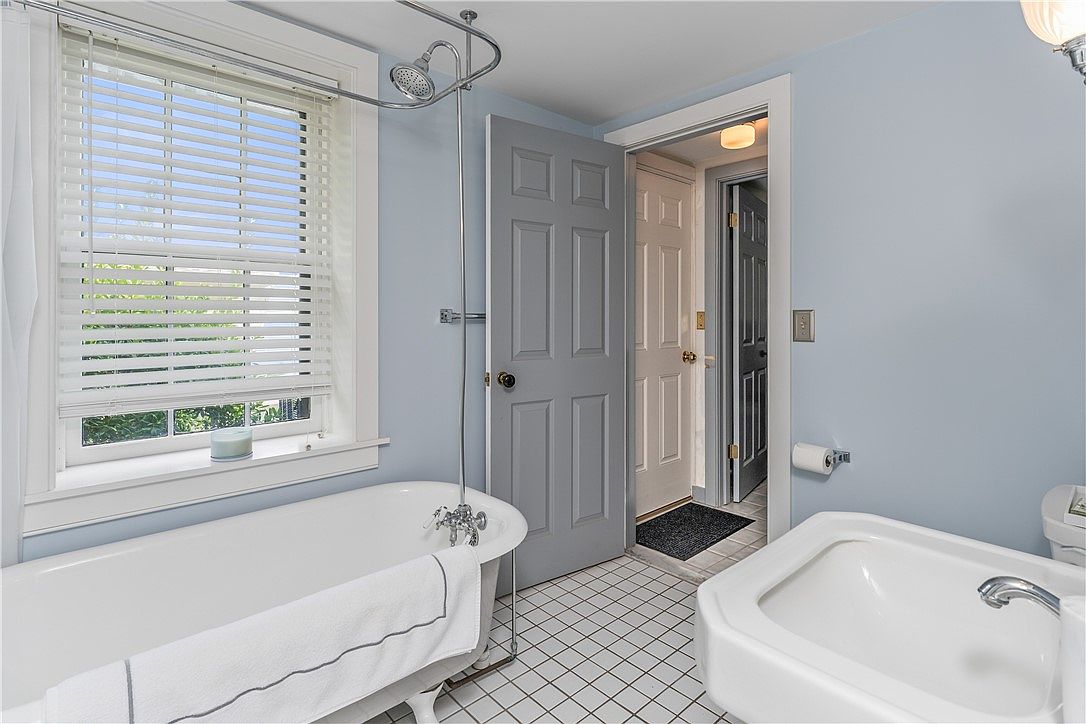 A serene and inviting bathroom is highlighted by soft blue walls and crisp white trim, creating a calming and fresh atmosphere. The room features a classic clawfoot tub with a rainfall shower fixture, perfect for relaxing baths or efficient showers for the whole family. Large windows allow plenty of natural light, with white blinds offering privacy and control over brightness. White square tile flooring ensures easy cleaning and durability, making this space practical for children or guests. Thoughtful touches like a plush towel, a candle, and spacious layout combine elegance with everyday comfort and functionality.
