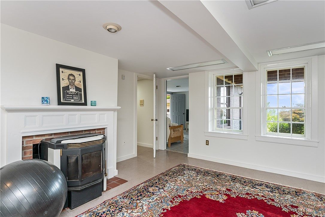 A welcoming family room features a cozy pellet stove nestled in a classic white mantle with brick detailing, providing both warmth and character. The neutral walls and large windows allow abundant natural light to fill the space, enhancing its airy and inviting atmosphere. A vibrant, patterned area rug brings a pop of color and anchors the room, making it ideal for both relaxation and gatherings. The adjoining room and visible exercise ball suggest thoughtful multi-purpose use, perfect for active families. Clean architectural lines, practical flooring, and charming trim work combine for a timeless, functional living space suitable for all ages.