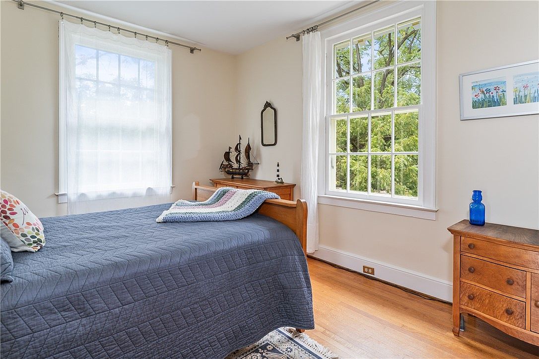 This guest bedroom exudes warmth and tranquility with its soft cream walls, honey-toned hardwood floor, and expansive double-hung windows that allow sunlight to stream in, making the room feel bright and airy. The bed is dressed in a quilted charcoal blue coverlet and accented with colorful pillows and a hand-crocheted throw, adding a touch of coziness. Simple, classic wood furniture brings an inviting, timeless feel, while whimsical touches like a model ship and playful artwork ensure a family-friendly atmosphere. Sheer curtains soften the light and frame views of lush greenery outside, making the space ideal for relaxation or hosting loved ones.