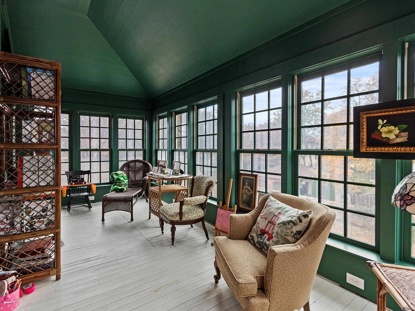 A serene sunroom featuring a rich green color palette that envelops the space in warmth and tranquility. Large windows allow abundant natural light to flood the area, creating a seamless connection with the outdoors. Cozy seating options, including a woven armchair and intricately patterned upholstered chairs, invite relaxation. A wooden shelving unit adds charm while providing functional storage, perfect for family games and books. The light hardwood floor contrasts beautifully with the darker walls, enhancing the room’s brightness, while framed artworks and decorative plants add personality, making it an inviting place for family gatherings or peaceful moments.