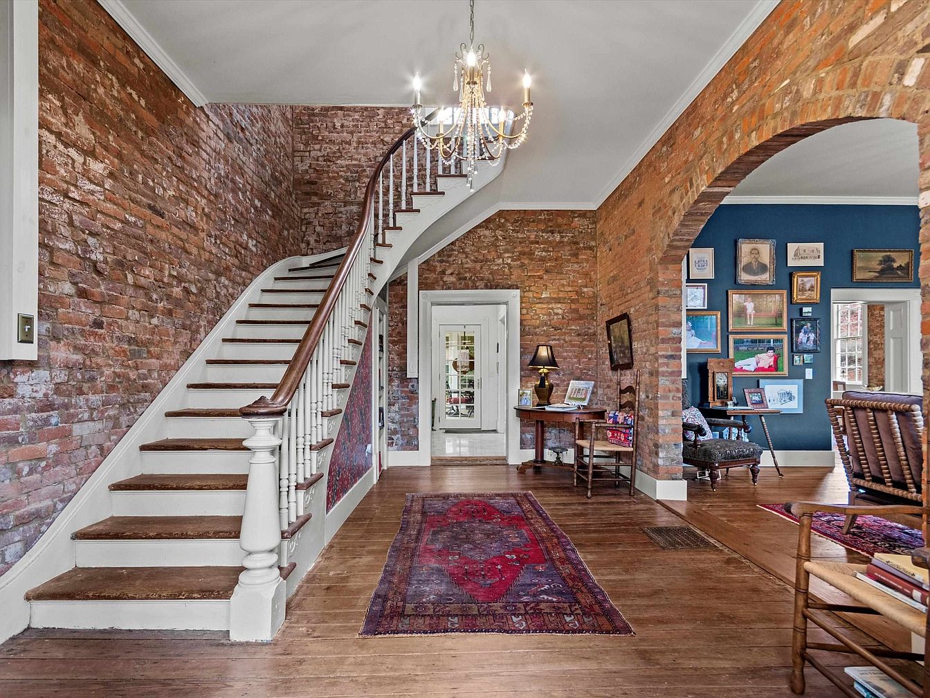 This inviting entryway features a stunning staircase with elegant white railings, leading to a spacious upper level. The rustic charm of exposed brick walls adds warmth, complemented by rich wooden flooring that enhances the homey atmosphere. A vintage chandelier hangs overhead, casting a soft glow, while a patterned runner rug brings a touch of color and comfort underfoot. Family-friendly elements are evident with cozy seating and curated picture frames that showcase cherished memories. Seamless transitions to adjacent rooms invite exploration, creating a welcoming space that balances tradition with contemporary touches, perfect for gatherings and family activities.