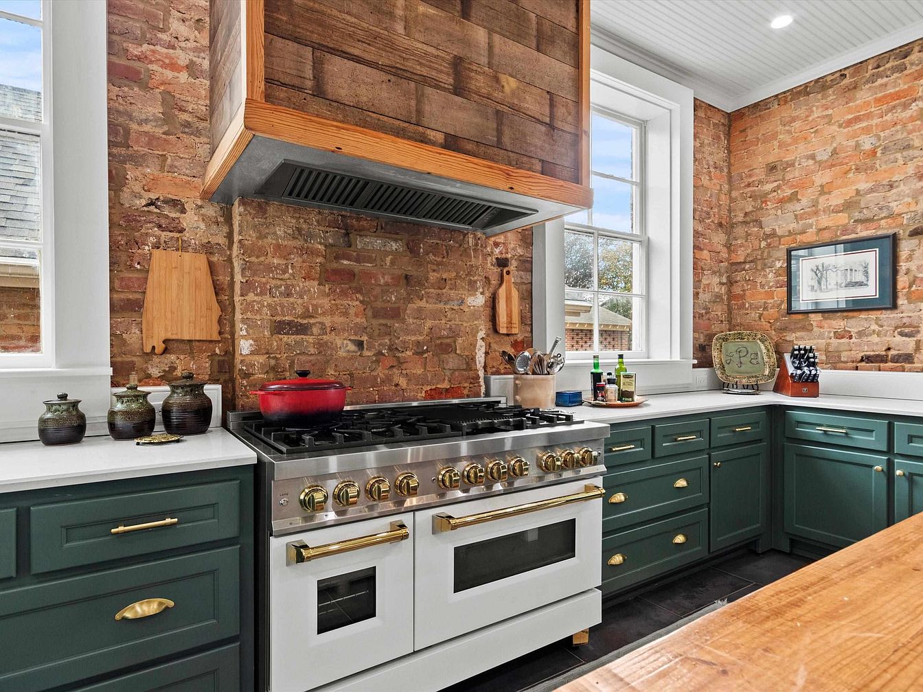 This charming kitchen features exposed brick walls that lend a rustic warmth, beautifully complemented by deep green cabinetry and sleek white countertops. A state-of-the-art stainless steel range with brass accents takes center stage, surrounded by a thoughtful layout that encourages family interaction. The large windows allow natural light to flood in, enhancing the welcoming atmosphere. Thoughtfully placed decor, including artisanal pottery and a wooden cutting board, adds personal touches. The integration of modern appliances within classic styling creates an inviting space, perfect for both cooking and gathering. This kitchen effortlessly blends functionality with aesthetic appeal.